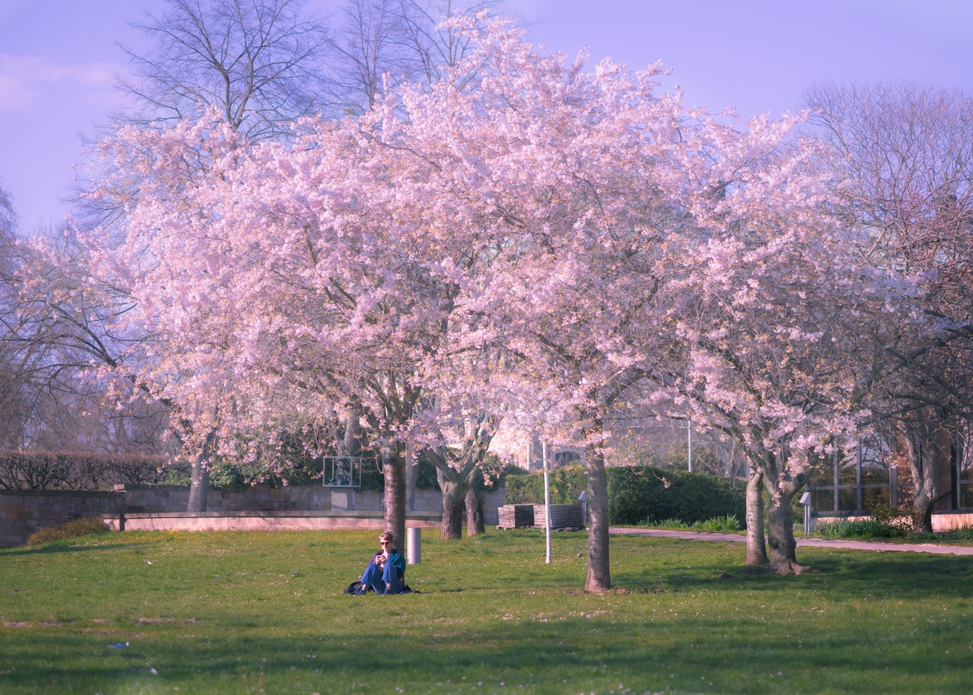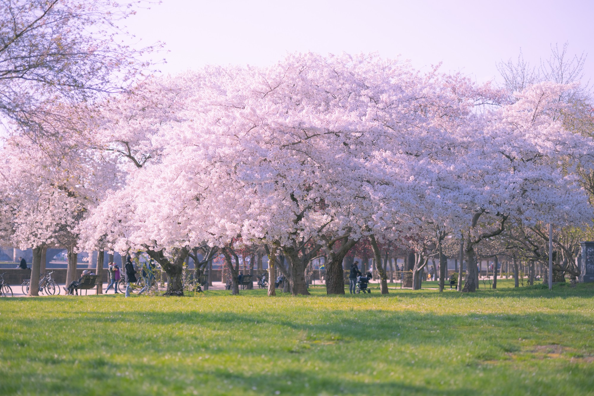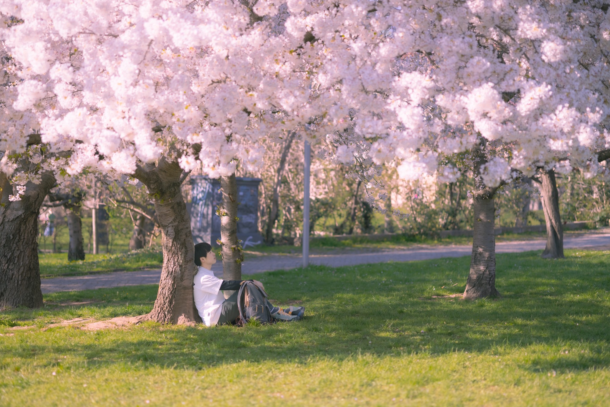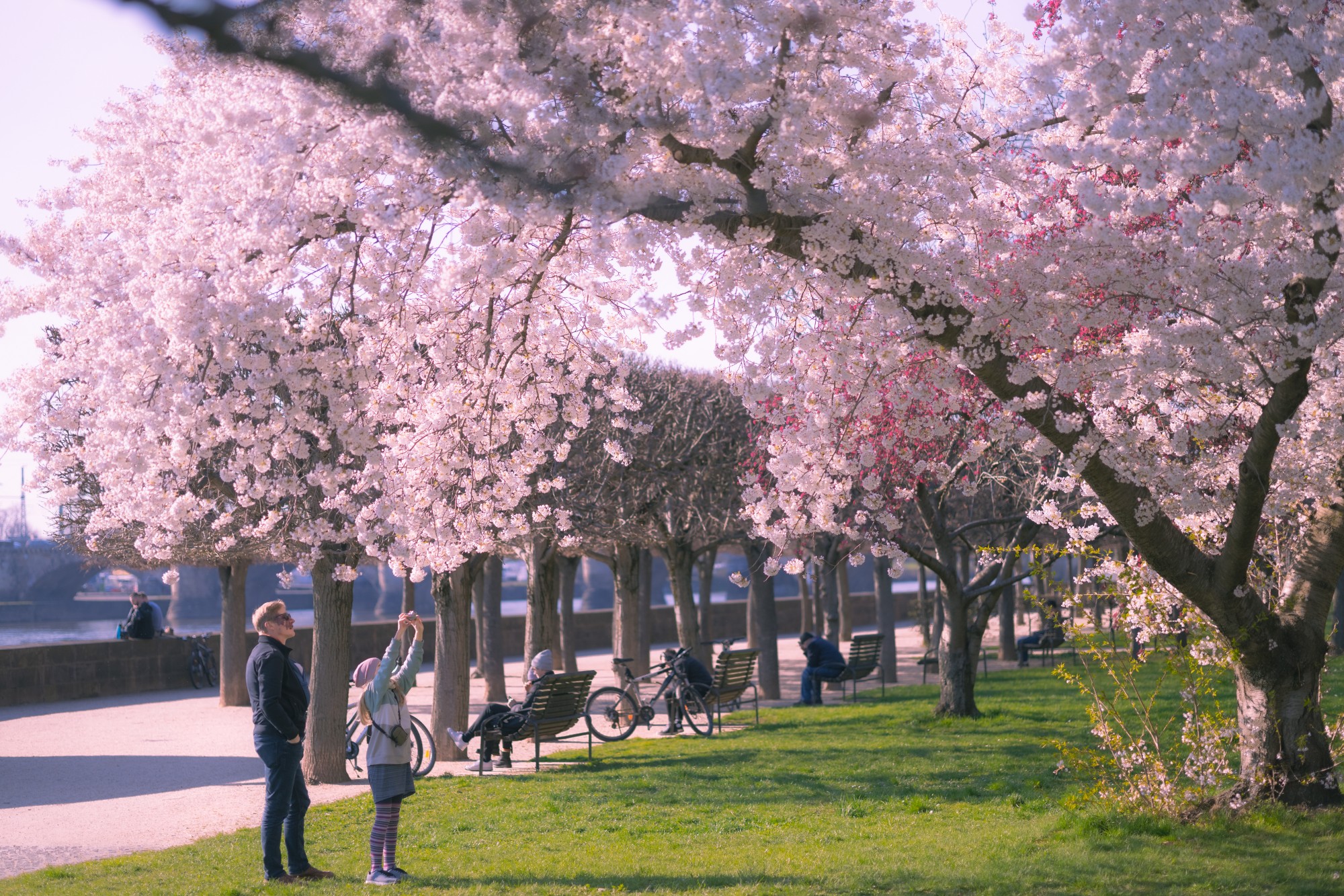 Hoa anh đào dưới ánh nắng ấm áp khiến con người được chiêm ngưỡng, cảm nhận vẻ đẹp của mùa xuân một cách đầy thư thái