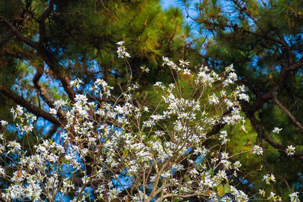Đầu năm mới, ngoài mai anh đào, hoa ban trắng cũng nở rộ, tô điểm thêm cho các tuyến đường nội ô.