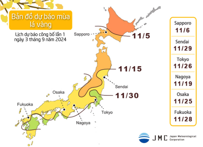 Theo Tổng công ty Khí tượng Nhật Bản (JMC), mùa thu năm nay, nhiệt độ dự kiến sẽ cao hơn bình thường trên khắp cả nước. Thời điểm lá thu đẹp nhất được dự đoán sẽ ngang bằng hoặc muộn hơn so với trung bình năm ở hầu hết các khu vực.
