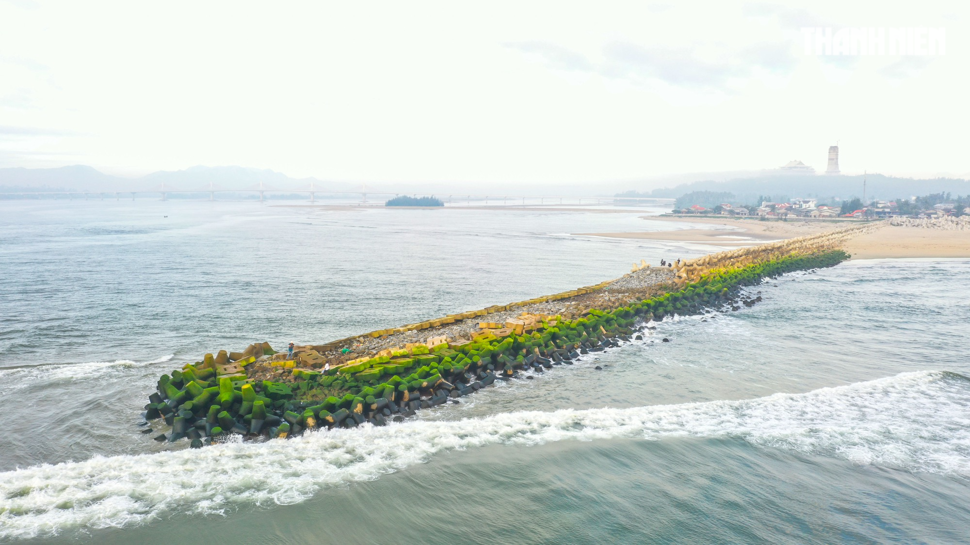 Đê giảm sóng, chắn cát dài khoảng 270m ở bờ bắc Cửa Đại trở nên đẹp hơn với lớp rêu xanh