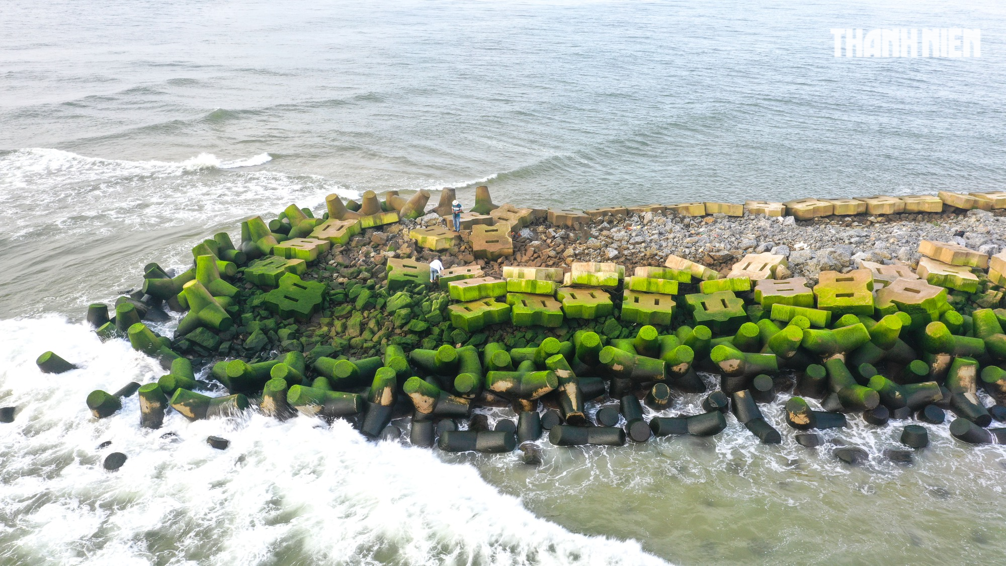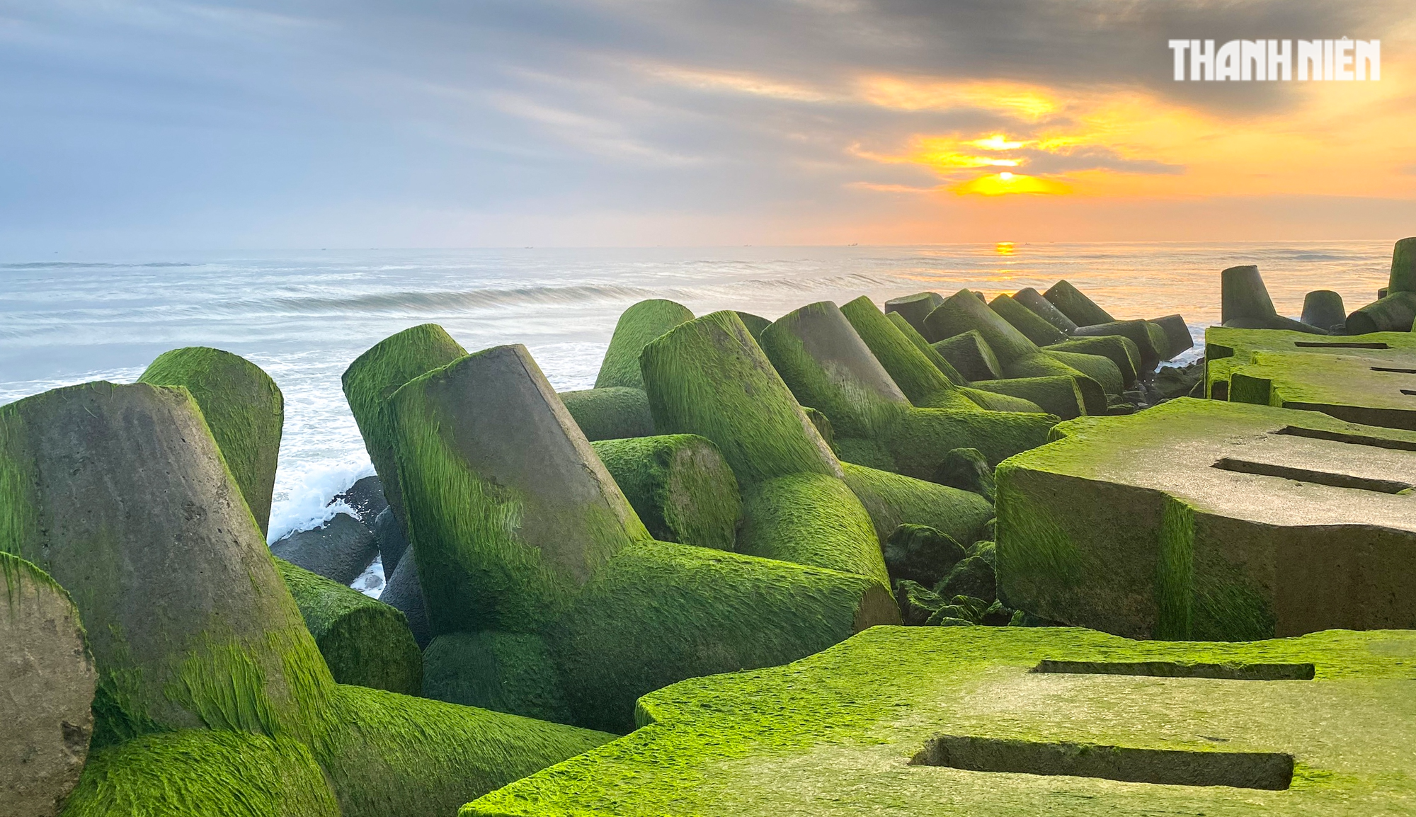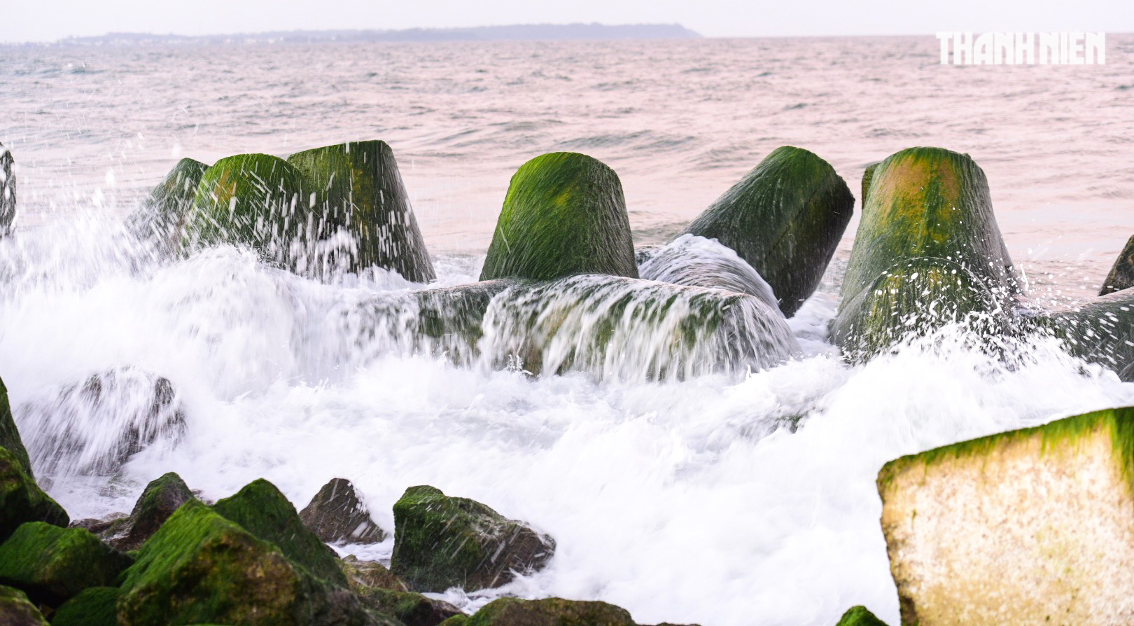 Sóng đánh vào các ụ bê tông có rêu mọc, nhìn giống như được phủ thêm một lớp tuyết trắng xóa