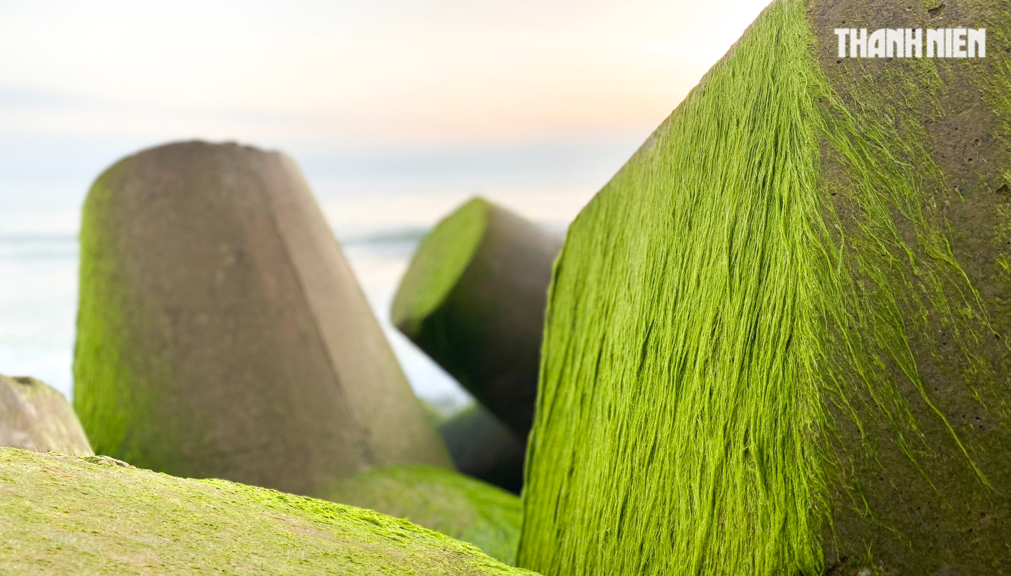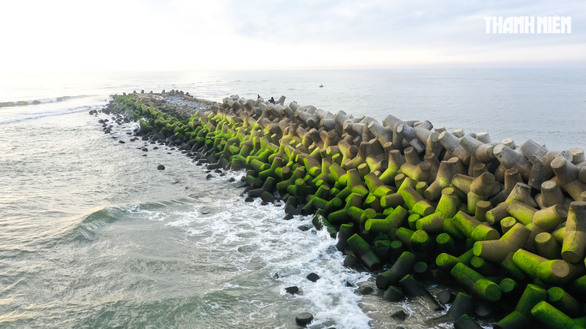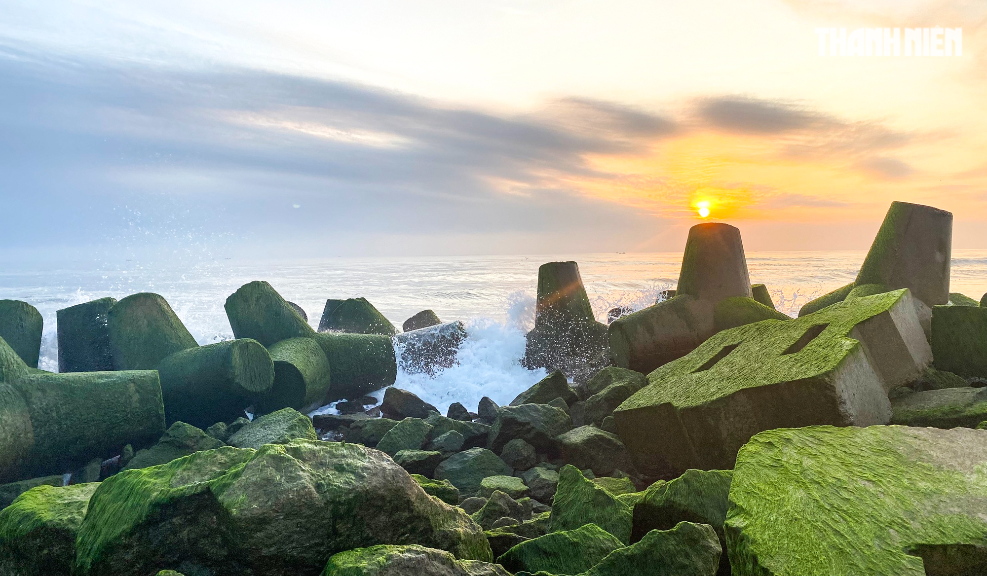 Sóng đánh vào các ụ bê tông có rêu mọc, nhìn giống như được phủ thêm một lớp tuyết trắng xóa