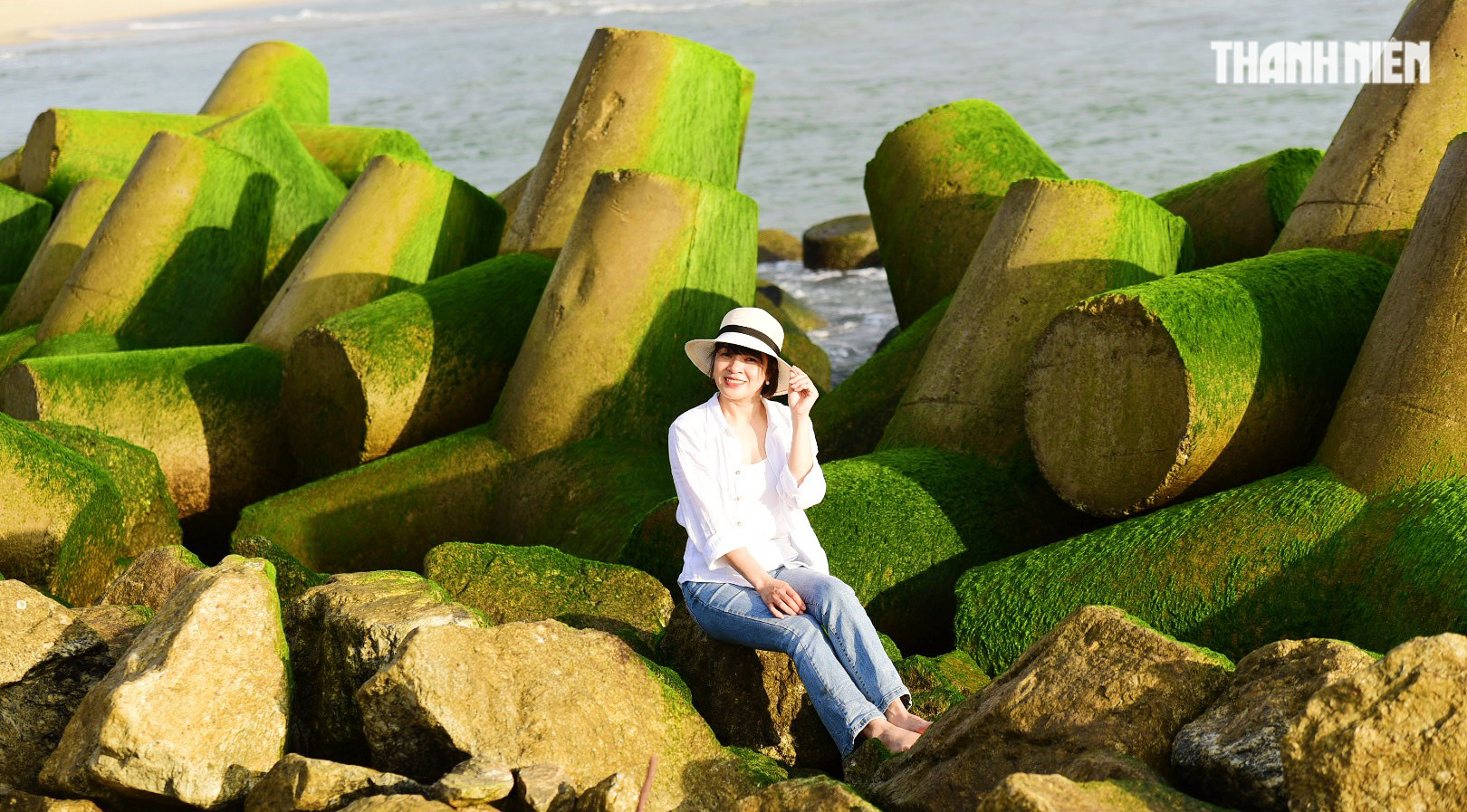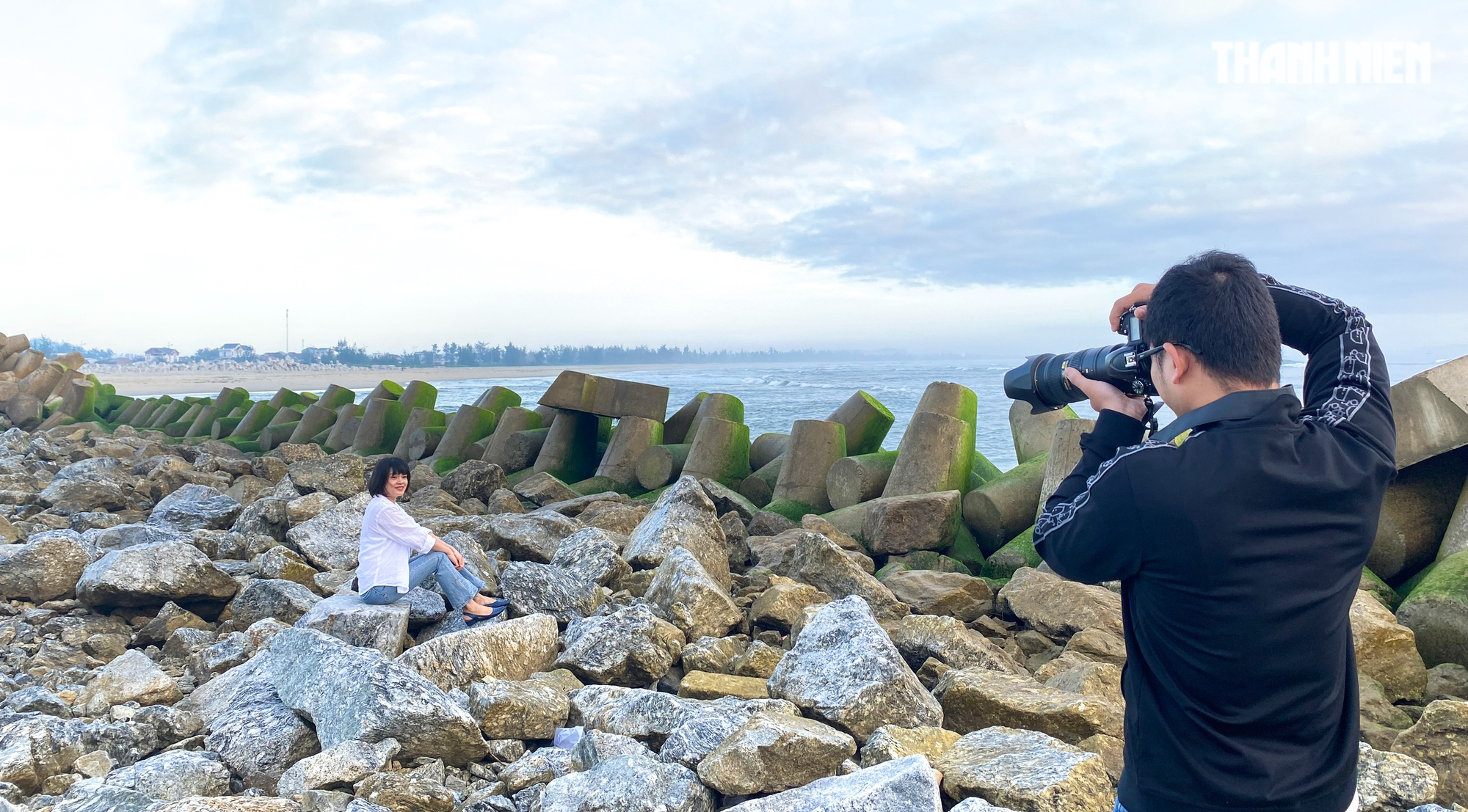 Theo ghi nhận của PV Thanh Niên, sáng 10.2, tại bờ kè chống sạt lở bờ bắc Cửa Đại (thuộc thôn Khê Tân, xã Tịnh Khê, TP.Quảng Ngãi, Quảng Ngãi), rêu xanh mọc bám vào các ụ bê tông dài hàng trăm mét, thu hút nhiều người đến chụp ảnh, săn ảnh đẹp.