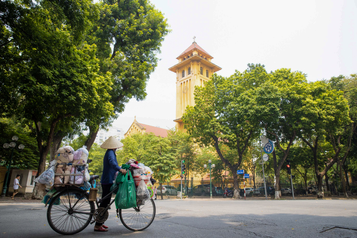Bức ảnh này được chụp trước nhà thờ lớn. Đến thủ đô dịp này, du khách sẽ bắt gặp nhiều gánh hàng rong bán hoa dọc các con phố. Ngoài các loài hoa thông dụng như hồng, vào tháng 9 du khách sẽ thấy cúc được bày bán nhiều hơn.