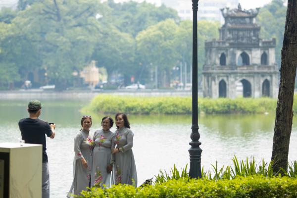 Khác với nhịp sống hối hả trên các con đường đông đúc, khu vực ven hồ dường như tĩnh lặng hơn. Mọi người thong thả đi dọc phố đi bộ, hoặc ngồi yên trên các ghế đá đặt quanh hồ, chụp ảnh lưu niệm...
