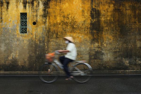 Góc phố nhỏ vẫn lác đác bóng xích lô nhìn qua khung cửa một công trình cổ ở Hội An trông giống cảnh phim quay chậm.