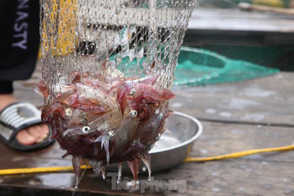 Những con mực tươi, còn nhảy tanh tách được vớt lên từ bờ để cân và đưa vào chế biến cho khách. Chủ yếu người đến thưởng thức mực gỏi và mực hấp, đây là hai món đặc sản chính ở bè.