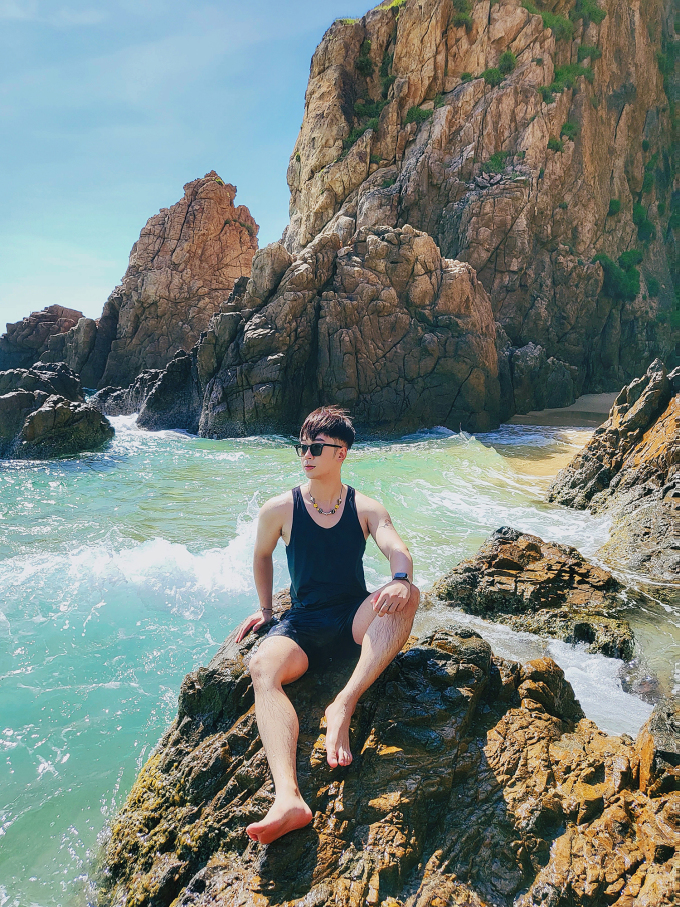 Kỳ Co - Eo Gió. Dù đã đến Quy Nhơn nhiều lần, chàng blogger vẫn "nao lòng" trước vẻ đẹp xanh mướt của Kỳ Co - Eo Gió. "Đây là điểm đến đáng giá nhất. Eo Gió được xem như kiệt tác thiên nhiên của núi, đá còn Kỳ Co lại được mệnh danh bãi biển đẹp nhất Bình Định. Hai nơi này trở thành 'cặp đôi hoàn hảo'", Ninh nhận xét.