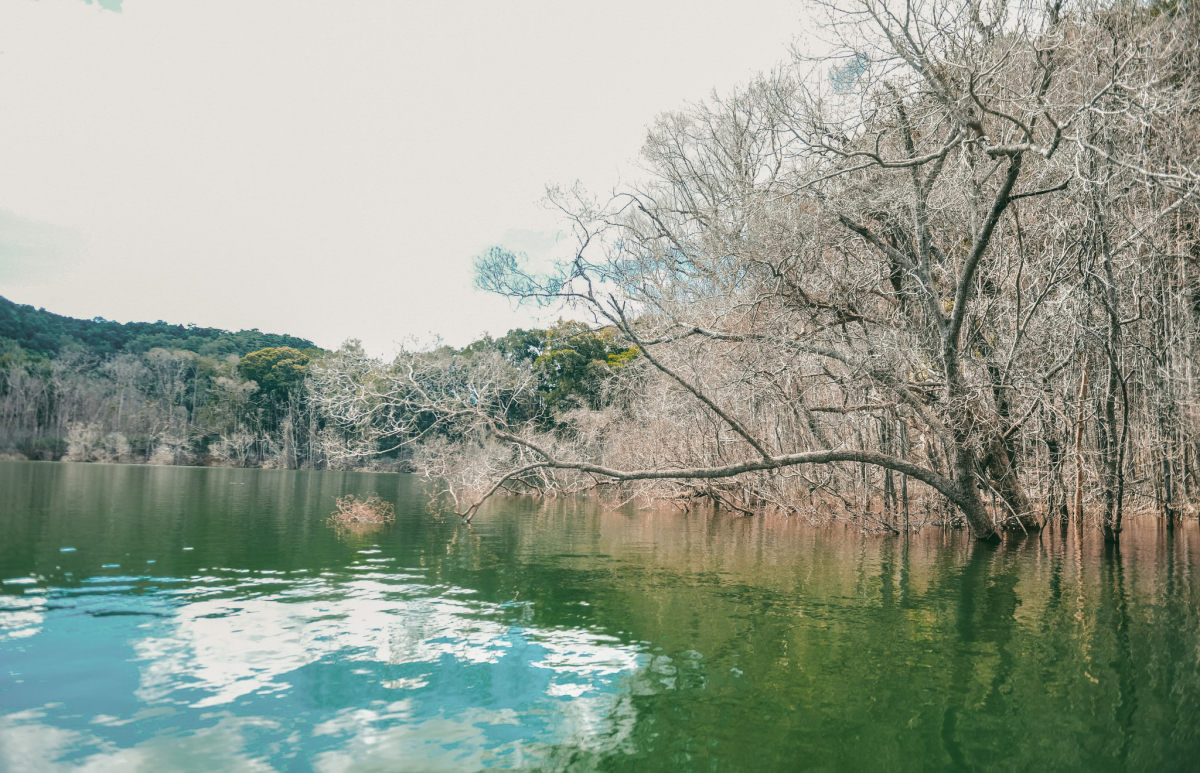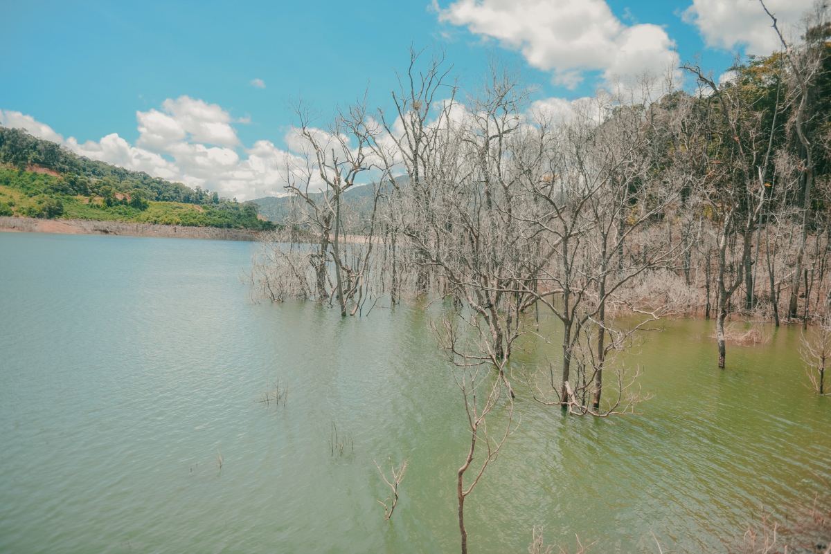Quá trình tích nước nhiều năm trong lòng hồ của công trình thủy điện vô tình đã khiến cho hàng trăm cây thông xung quanh hai bờ sông bị ngập nước, không còn khả năng phát triển và ngả sang màu trắng ngà. Dọc hai bên đường xuôi theo lòng hồ là thông trắng xen kẽ thông xanh phía sau.