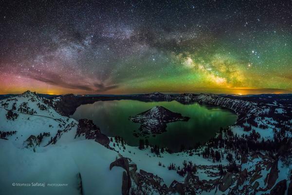 Đến với vườn quốc gia hồ Crater, bang Oregon, Mỹ, Safataj cắm trại 4 đêm và đi bộ hàng giờ trong gió và giá rét quanh hồ Crater mới có thể chụp được bức hình ưng ý. Cả dải ngân hà và bắc cực quang đều hiện lên trong một đêm bầu trời rất trong.