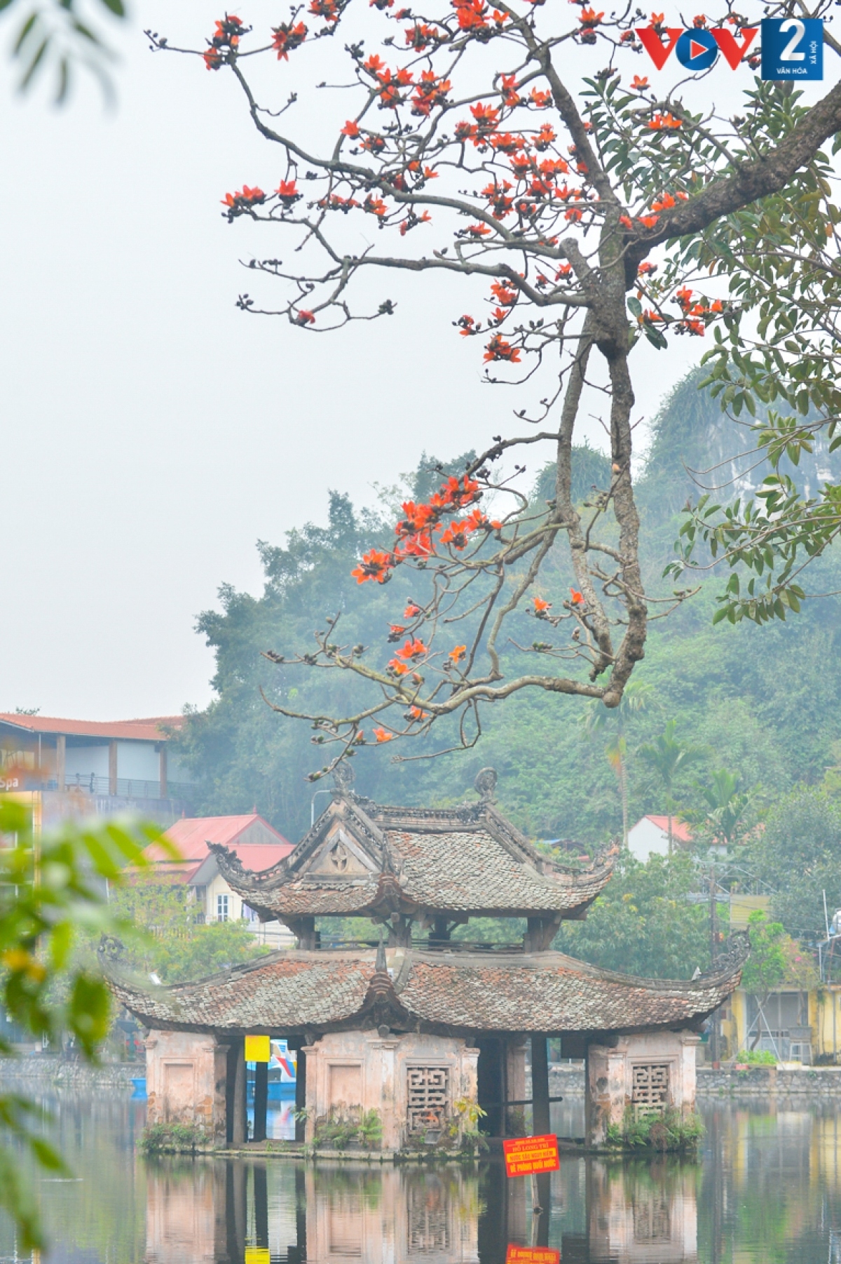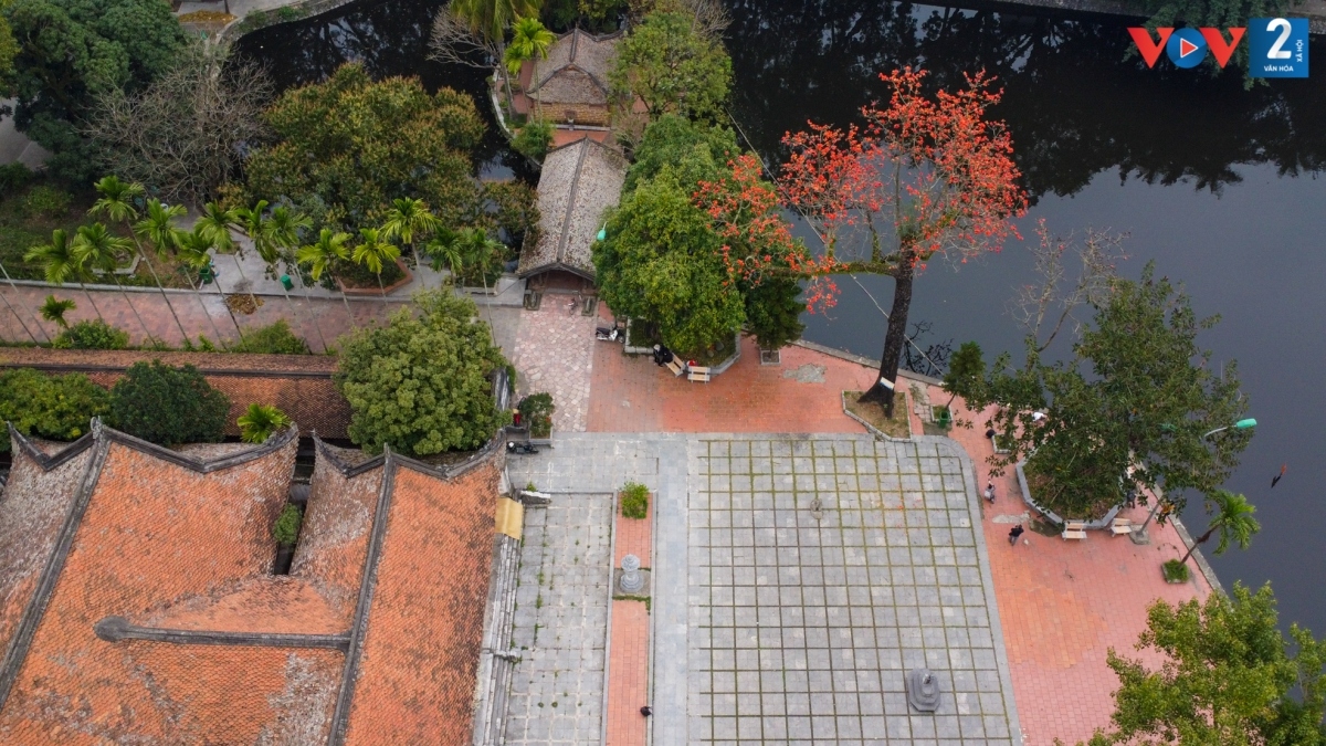 Hình ảnh cây gạo rực đỏ tạo nên khung cảnh thanh bình