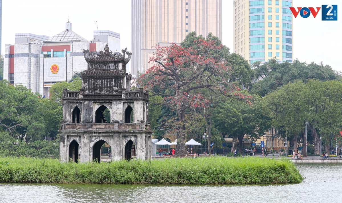 Tháp rùa cổ kính trong màu đỏ rực của hoa gạo