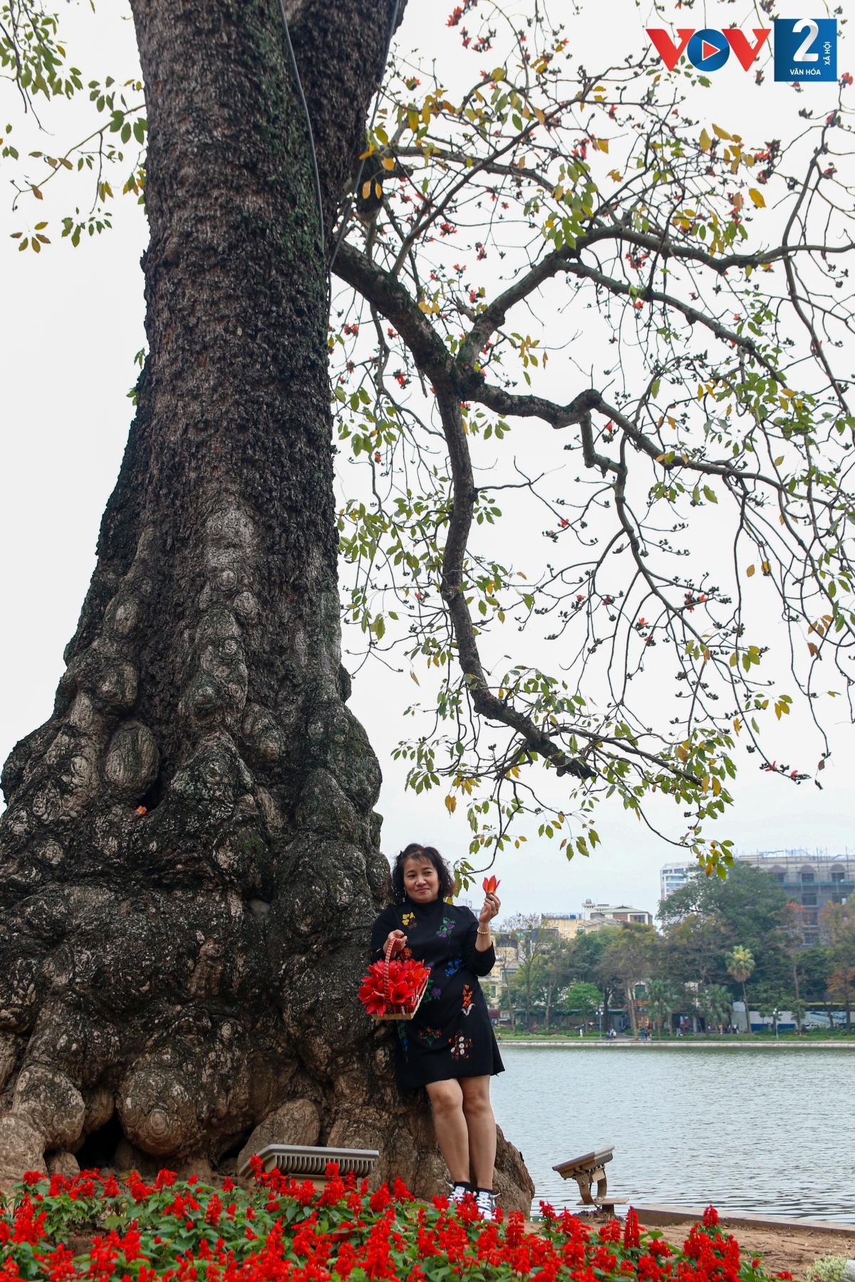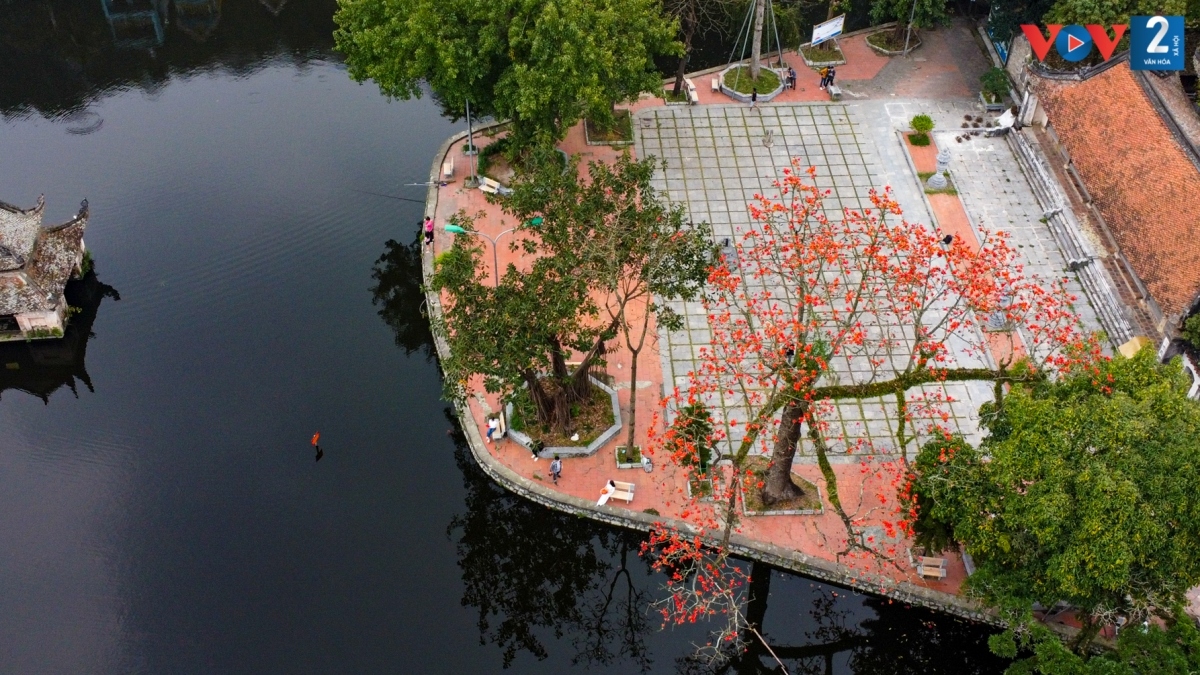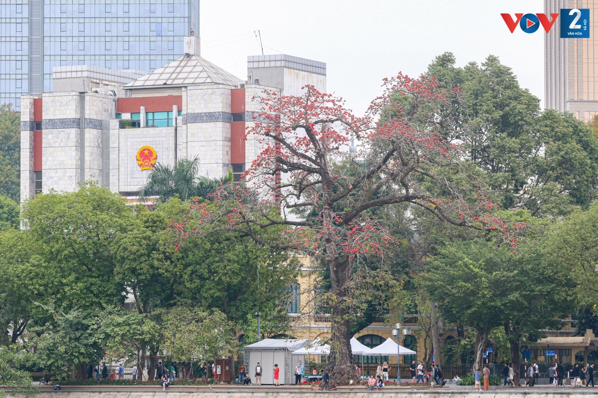 Cây gạo bên hồ Gươm năm nay ra hoa tuyệt đẹp. Cả cây bao phủ bởi một màu đỏ thu hút nhiều người tới check in.