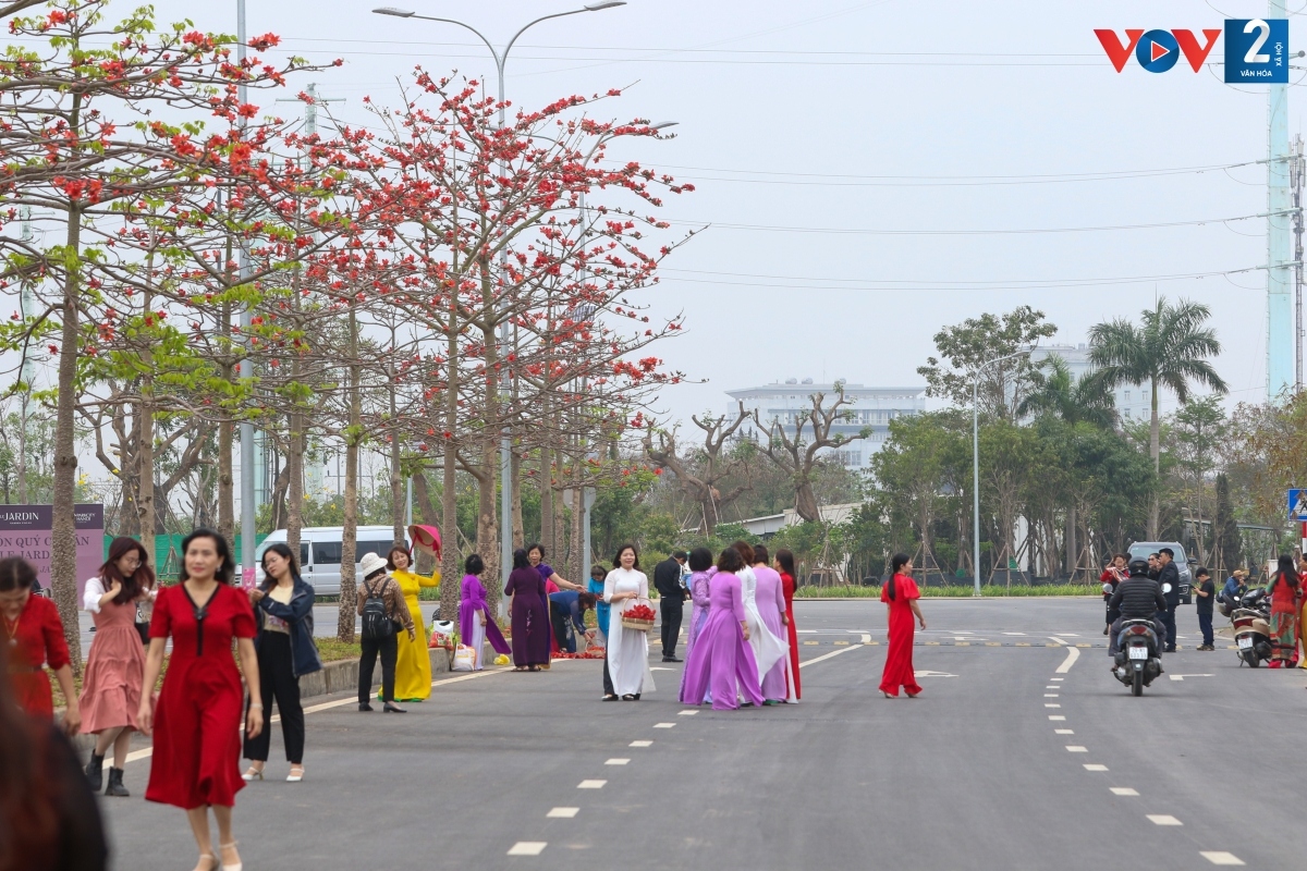 Khu đô thị ParkCity Hanoi (phường La Khê, quận Hà Đông) những ngày này rợp sắc đỏ của hoa gạo. Những cây gạo mới trồng còn non tuổi, cao khoảng 4-5m nên chưa có tán lá sum suê như ở các khu vực ven đô, nhưng hoa vẫn nở đỏ rực, thắp lửa trên những nhành cây.