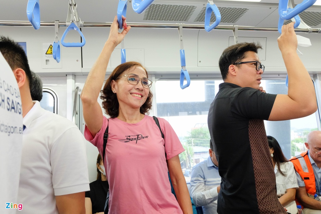 Bước vào khoang tàu, khách tham quan được trải nghiệm những khoang ghế ngồi hiện đại với màu xanh, điều hòa mát mẻ. Khoang tàu rộng rãi, dù hành khách đứng kín khoang, người ngồi vẫn cảm thấy thoải mái, không bị ngộp hay chật chội, khó chịu.