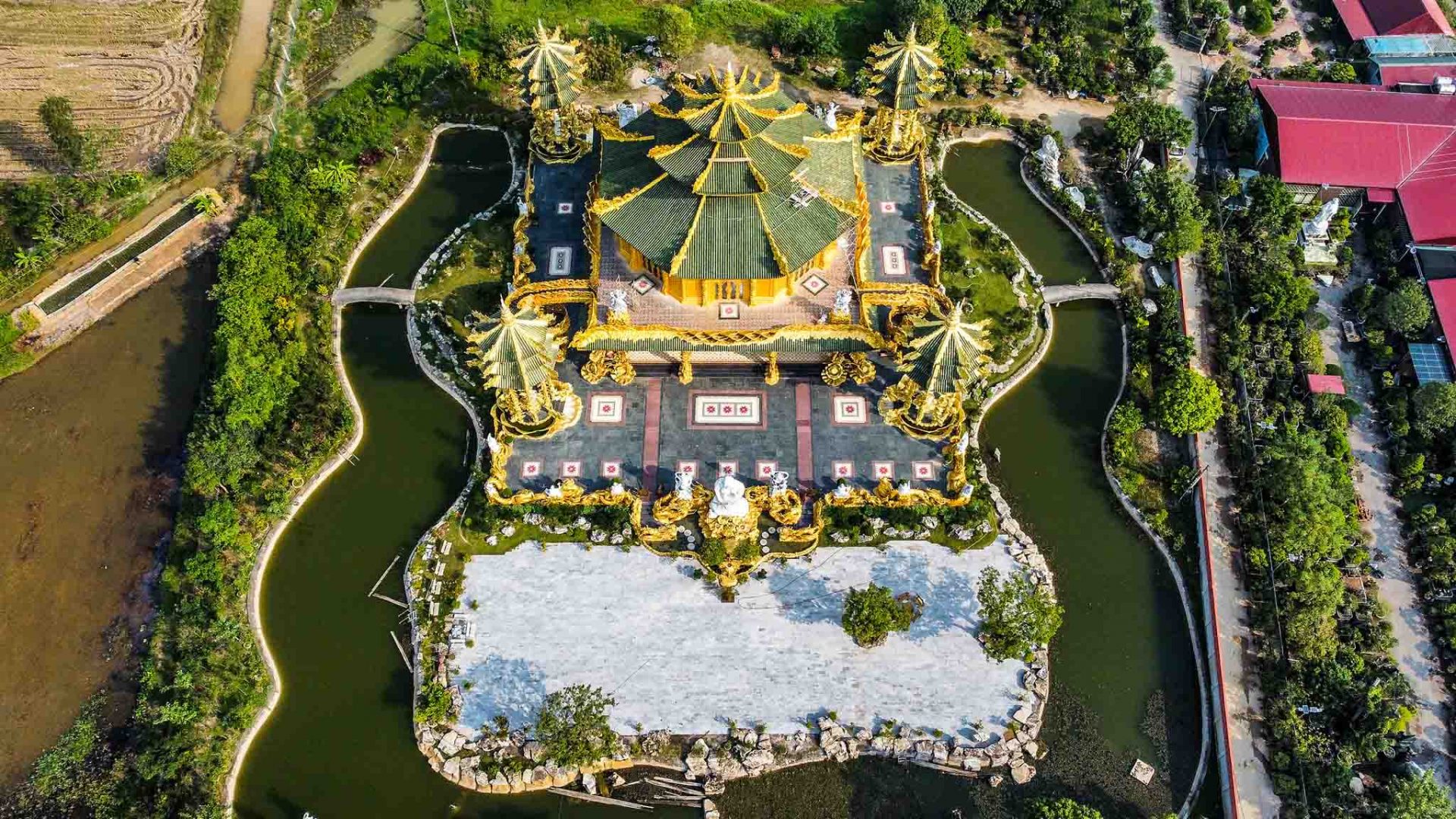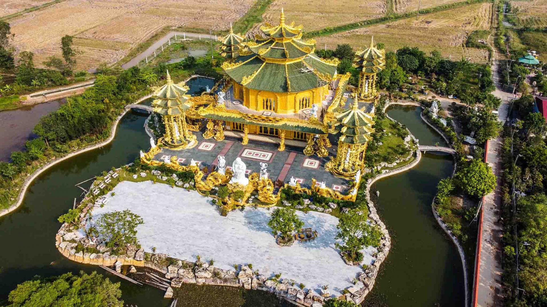 Chùa được lợp ngói men xanh ngọc và sơn phủ vàng tạo thành kiến trúc nổi bật, bao quanh là cánh đồng lúa bát ngát. Ảnh: Vương Lộc