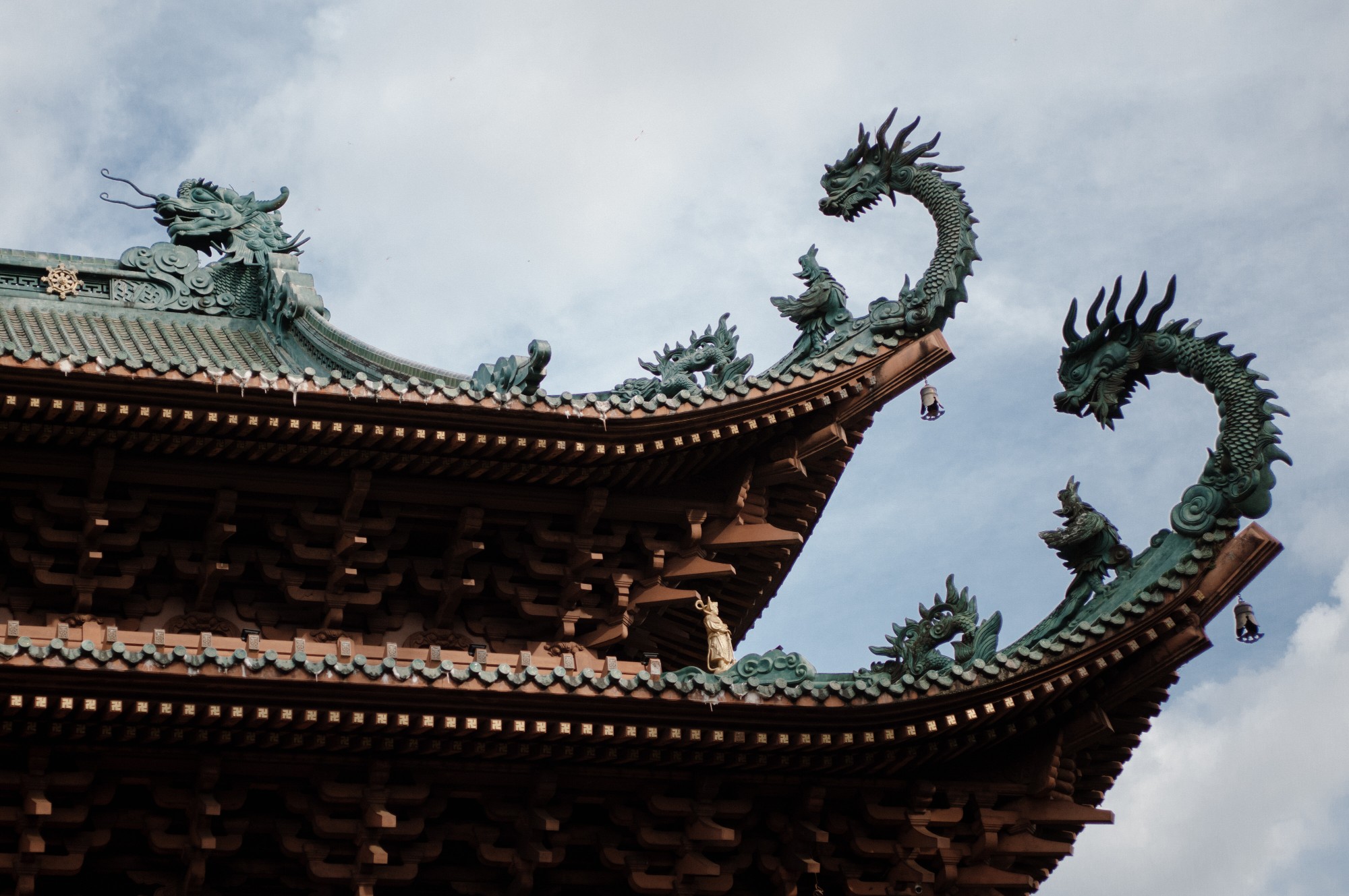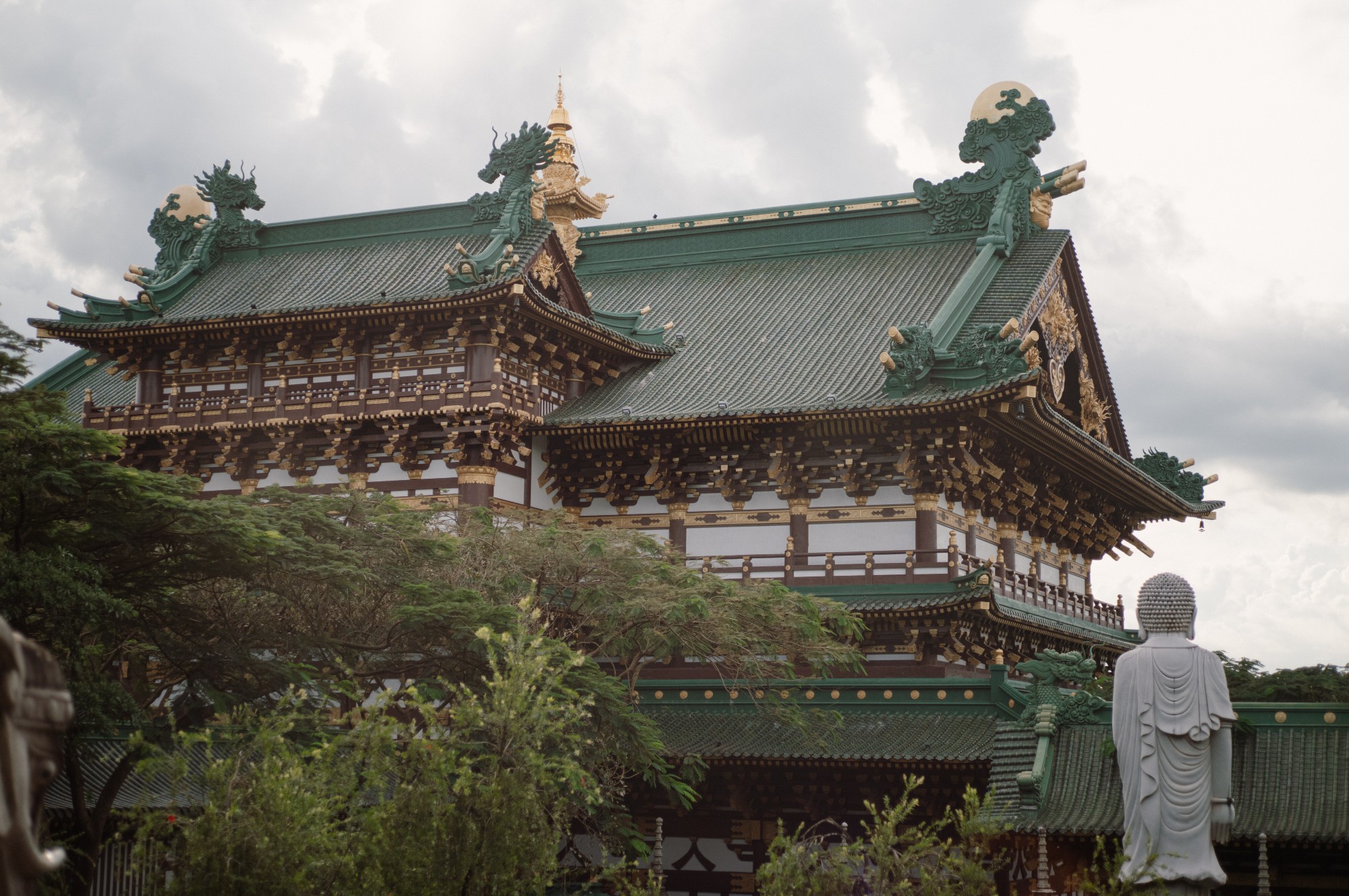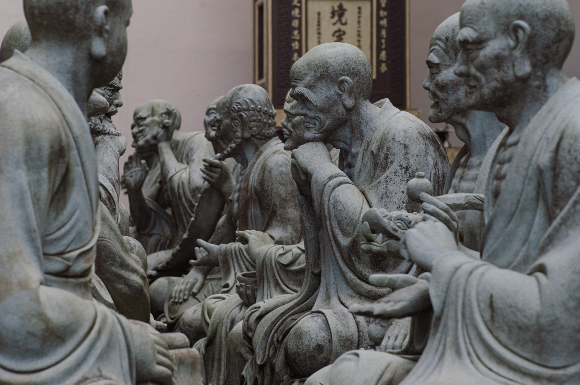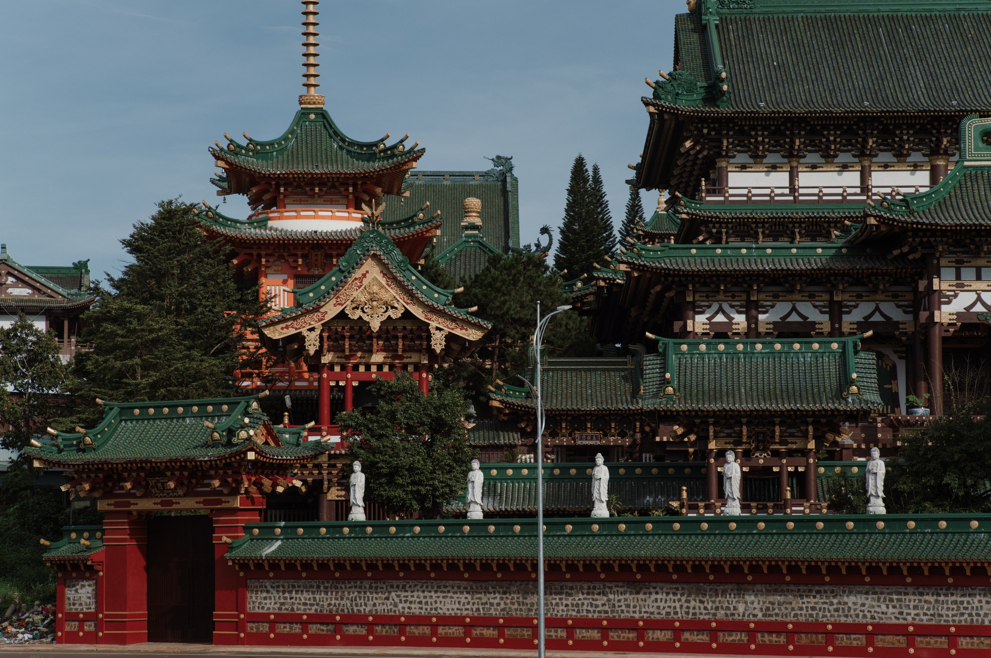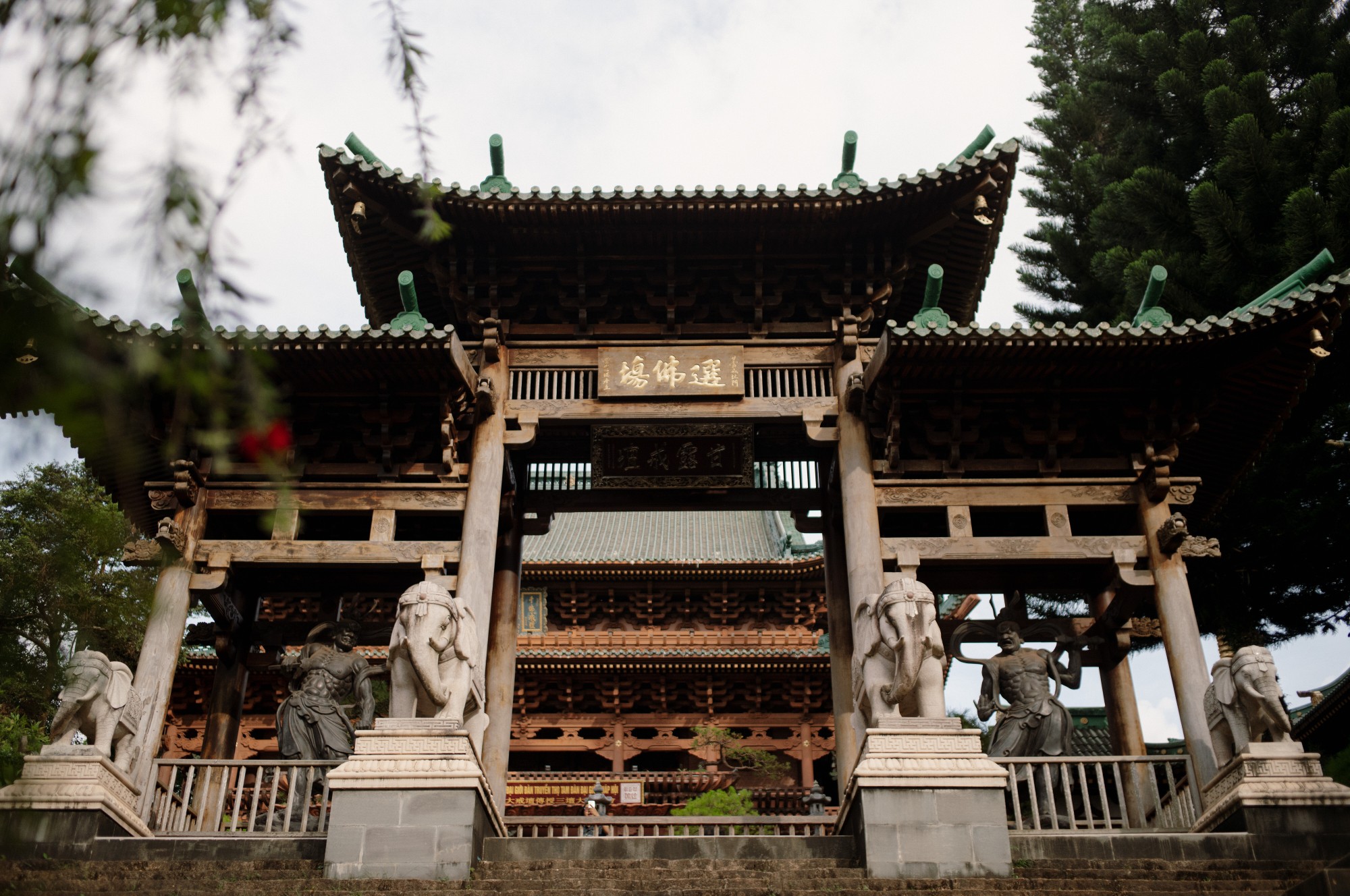 Trước mặt chánh điện là tượng đá 18 vị la hán bề thế nhuốm màu rêu phong của thời gian. Khu tăng phường nằm bên phải chánh điện có diện tích hàng ngàn mét vuông bao gồm trai đường, giảng đường, thiền đường và tàng kinh cát.