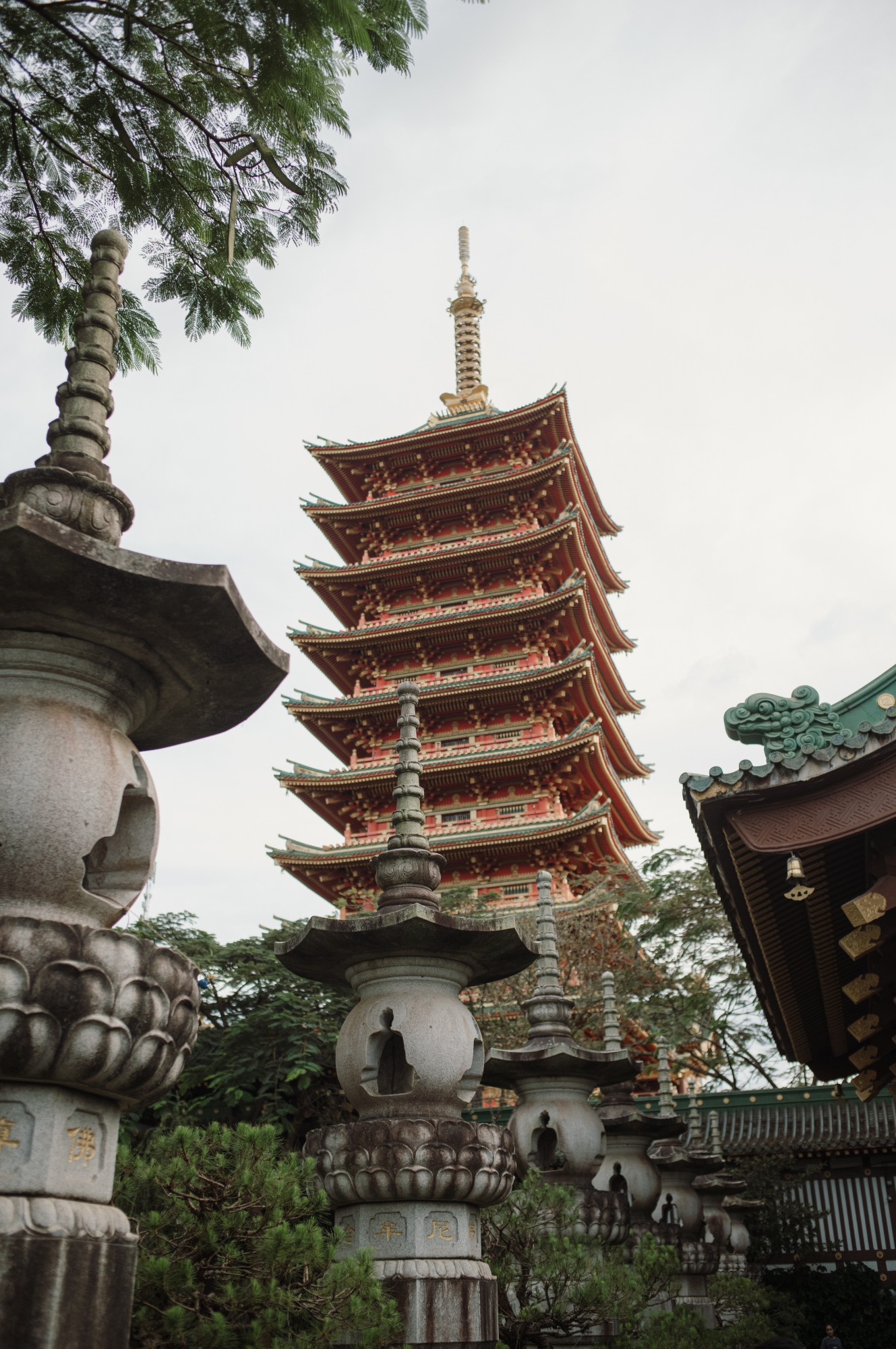 Một công trình vô cùng độc đáo khác là ngôi bảo tháp thờ Xá Lợi 9 tầng cao 72m, được tôn trí bên trong bảo tháp là 4 vị Thiên thủ Thiên nhãn, cao 8m và ngang 3,5m, được chạm khắc rất tinh tế sống động từng chi tiết bằng gỗ mít. Tầng 1 và các tầng khác sẽ là nơi thờ thất Phật và Xá lợi của đức Phật Thích Ca Mâu Ni. Bảo tháp với gam màu chủ đạo là đỏ và vàng rực rỡ. Đây cũng là công trình nằm trong top công trình kiến trúc cao nhất của thành phố Pleiku.