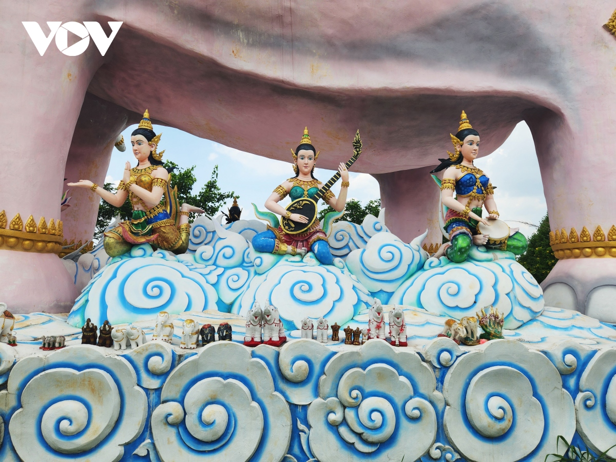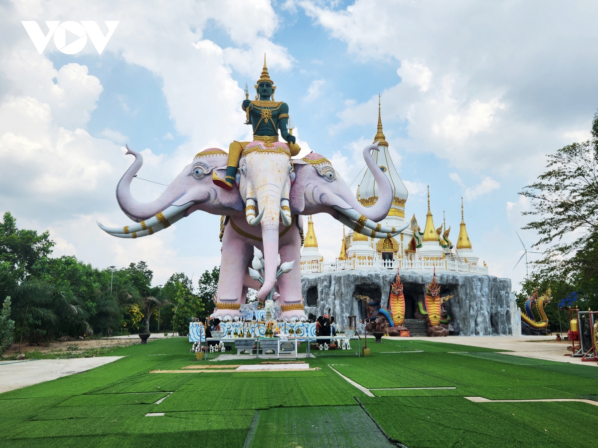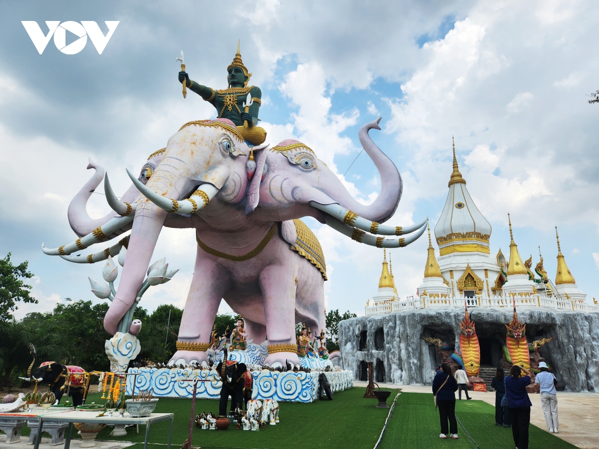 Khi bước vào chùa Wat Dan Phra In, du khách sẽ thấy tượng thần Indra cưỡi voi ba đầu màu hồng cho thấy sự uy nghiêm và linh thiêng của ngôi chùa này.