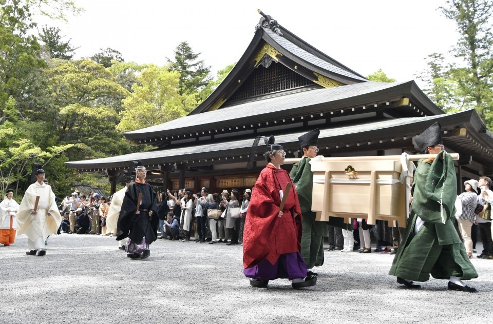 Việc xây lại đền chính được thực hiện trên khu vực cạnh công trình hiện tại, sau 20 năm lại đổi về vị trí cũ. Đền cũ được tháo dỡ, và đền mới được xây dựng với kích cỡ, chi tiết chính xác như trước đó. Lần gần nhất - lần thứ 62 - là vào năm 2013, và lần tiếp theo dự kiến vào năm 2033. Ảnh: Japantimes.