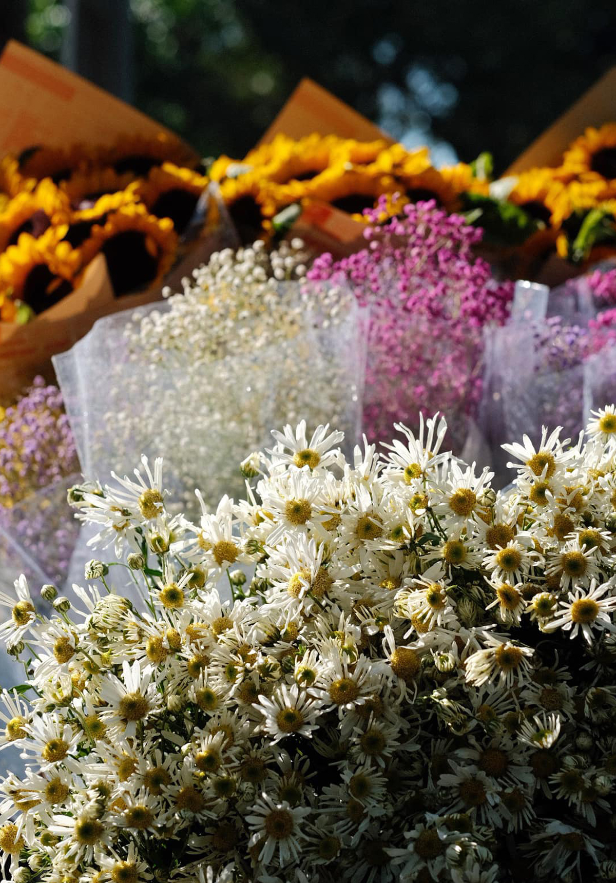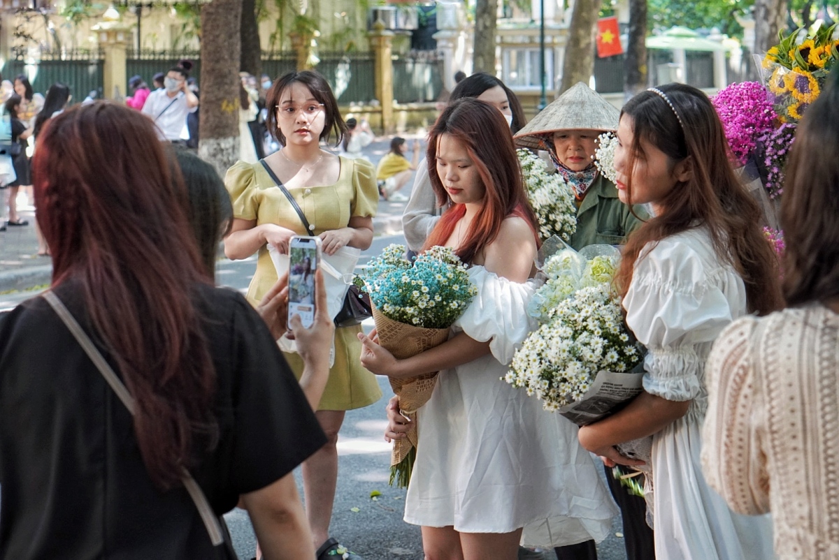 Các xe bán hoa di động tấp nập người mua. Một số loại hoa được ưa chuộng như sen trắng, cúc hoạ mi, thạch thảo… với mức giá dao động từ 80.000 đến 150.000 đồng một bó.