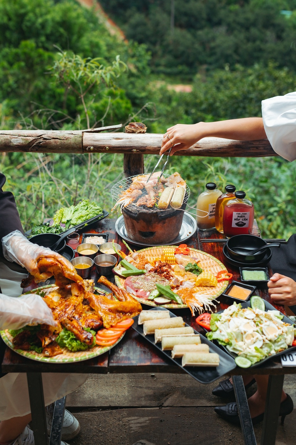 Bạn nên thưởng thức ba chỉ nướng sa tế sốt me, sườn cây non sốt chanh dây hay bò sốt pate tiêu xanh chấm bánh mì... khi đến quán. Ảnh: Quán nướng Chill in Dalat. Món khai vị gồm khoai tây chiên, salad trứng, chân gà rút xương chiên giòn.... Các món nướng từ heo, bò và hải sản. Ba chỉ nướng sa tế sốt me, sườn cây non sốt chanh dây hay bò sốt pate tiêu xanh chấm bánh mì là một số món bán chạy nhất tại quán.