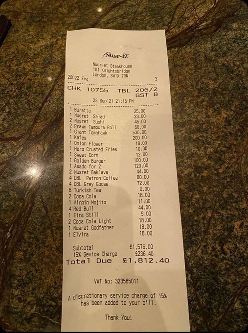 Hóa đơn cho một bữa ăn được thực khách đưa lên cùng lời phàn nàn về mức giá đắt đỏ. Ảnh: jjamz_. Năm ngoái, một lời phàn nàn về giá cả cũng lan truyền trên mạng xã hội sau khi một vị khách bị tính 3.495 USD cho một bữa ăn tại nhà hàng của Salt Bae. "Chuỗi nhà hàng lớn nhất của anh ấy? Tôi bị tính 22 USD cho một lon Redbull", vị khách này chia sẻ.