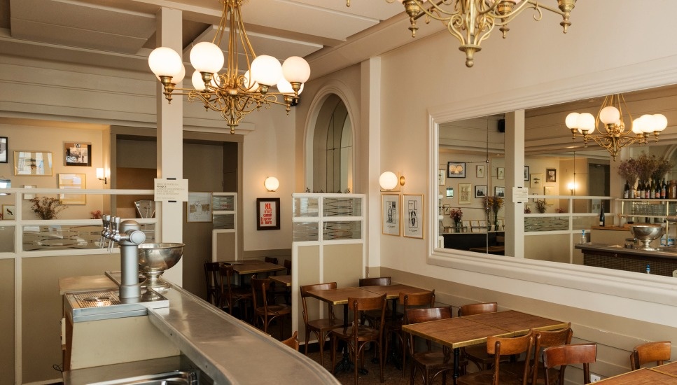 Ảnh: Le Mermoz. Nếu du khách không muốn xếp hàng dài trước nhà hàng nổi tiếng Laudrée, Le Mermoz là một lựa chọn hợp lý gần Khải Hoàn Môn. Thực đơn nhà hàng thay đổi theo mùa, nổi bật là món súp hành tây cổ điển nấu cùng trứng cá hồi và hạnh nhân thái mỏng.