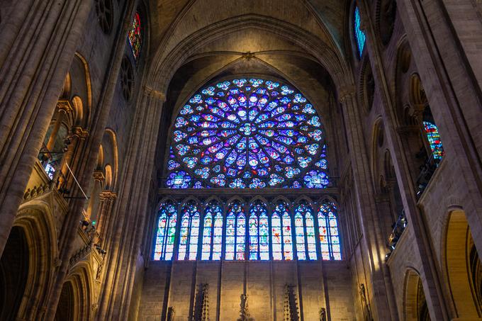 Cửa sổ kính màu, đặc biệt là những cửa sổ hoa hồng, là một trong những đặc điểm nổi tiếng nhất của nhà thờ Đức Bà. Những ô kính đã được thay thế trong thế kỷ 19 sau nhiều dự án trùng tu nhưng nội dung vẽ trên kính vẫn là những câu chuyện trong Kinh thánh như trước. Ảnh: Westcoaster.
