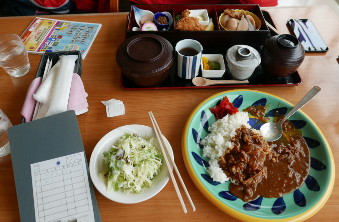 Bữa trưa trong nhà hàng ở bảo tàng lịch sử Osaka. Trong một set đồ mà có đến mười mấy thành phần, với tất cả các nhóm dinh dưỡng như gà, cá, hàu tươi, rau củ quả, trứng hấp, cơm, canh, trà xanh... không thiếu vị nào. Để có sức đi chơi cả một ngày dài trong khu di tích nổi tiếng của thành phố, chúng tôi gọi thêm một suất cơm cà ri bò kèm salad bắp cải với giá chỉ 900 yên (162.000 đồng). Đây là giá bình dân so với mức sống cao thuộc hàng nhất thế giới của Nhật.