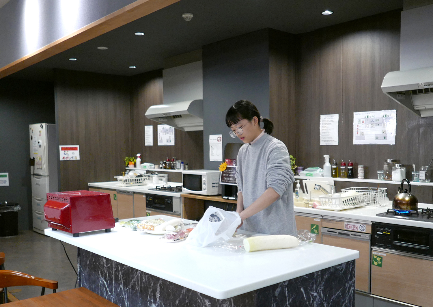 Tuy vậy, để tiết kiệm chi phí, chúng tôi thường đến các chợ và cửa hàng tiện lợi ở mỗi thành phố mình đi qua và mua thực phẩm về nấu. Chúng tôi đặt phòng ở các hostel (nhà nghỉ) có sẵn bếp nên việc nấu nướng thuận tiện và đơn giản. Gọi là nhà nghỉ nhưng hầu hết các cơ sở lưu trú này đều có quy mô lớn, khang trang sạch đẹp, phục vụ được hàng chục, hàng trăm khách một lúc. Thậm chí có những căn bếp - phòng ăn rộng rãi, trang bị đủ máy móc như một nhà hàng, được sử dụng thoải mái không phải trả thêm phí.