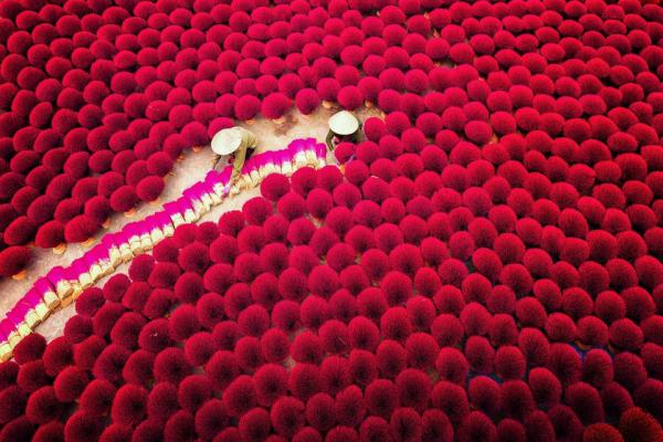 Trước thềm Tết Nguyên đán, du khách đến làng hương này sẽ được dịp chiêm ngưỡng hàng trăm nén hương màu hồng tươi được xòe ra như những bó hoa dọc đường làng và khắp sân nhà của người dân.