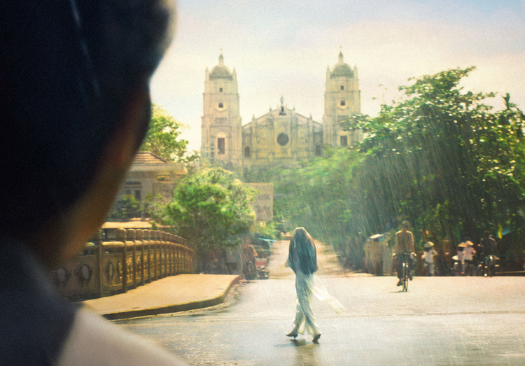 Trong phân đoạn Trịnh Công Sơn đi theo dấu chân Bích Diễm dưới mưa, khán giả có thể bất ngờ với hình ảnh một nhà thờ lạ lẫm. Thực tế, đây là hình ảnh cũ của nhà thờ Phủ Cam ở TP Huế. Hiện tại, nhà thờ đã được tu sửa và có hình dáng mới. Công trình có vị trí đẹp trên một ngọn đồi nhỏ có tên là Phước Quả ở bờ nam sông Hương. Đây là một trong những giáo đường lớn nhất, nổi tiếng nhất xứ Huế. Ảnh: Em và Trịnh, Hà Thành