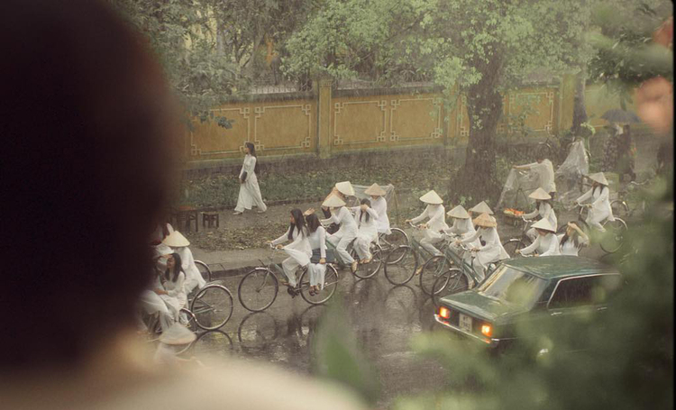 Đường Nguyễn Trường Tộ phía bên ngoài trường nữ sinh Đồng Khánh, nay là THPT Hai Bà Trưng, TP Huế xuất hiện lãng mạn dưới một cơn mưa trong phim. Ngôi trường được vui Khải Định đặt viên đá đầu tiên xây dựng, mang tên Đồng Khánh để thể hiện sự tôn kính của hoàng đế Khải Định với vua cha Đồng Khánh. Ảnh: Em và Trịnh, Nguyễn Hoàng Anh Thư