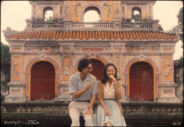 Trịnh Công Sơn và Dao Ánh cười đùa, ăn kem trước cửa Hiển Nhơn. Cửa nằm ở phía đông của Hoàng Thành trên đường Đoàn Thị Điểm, TP Huế. Hiện tại cửa Hiển Nhơn chỉ dùng cho nhân viên trung tâm Bảo tồn Cố đô Huế ra vào, không mở cửa cho khách tham quan theo lối này, ngoại trừ những ngày lễ hội khi có nhiều du khách tham quan nhưng bạn vẫn có thể đứng trước cổng để chụp ảnh, chiêm ngưỡng hoa văn tinh xảo. Ảnh: Em và Trịnh, VnExpress Marathon