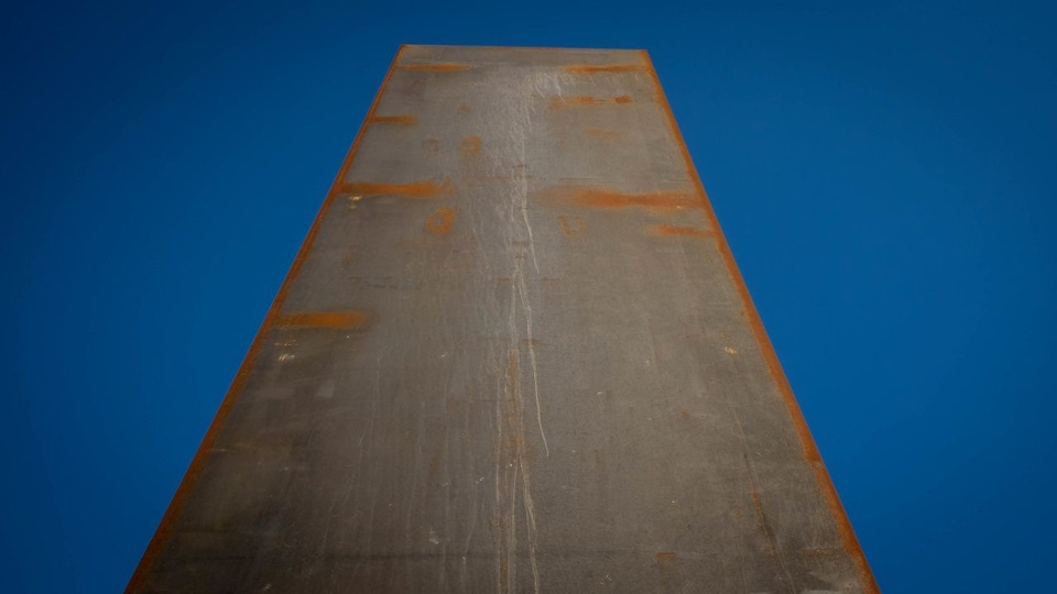 Tấm kim loại khổng lồ cao tới 16,7 m. Ảnh: Barry Neild/CNN. Các tấm thép được đặt cách nhau 250 m dọc theo một đường thẳng. Khi lại gần sẽ thấy cột thép phía sau cao hơn phía trước dù chiều cao của chúng bằng nhau nhờ thủ thuật phối cảnh có chủ ý. Khi tới đây vào buổi chiều, ánh nắng mặt trời đi qua các cột thép tạo ra những bóng râm khổng lồ giữa sa mạc.