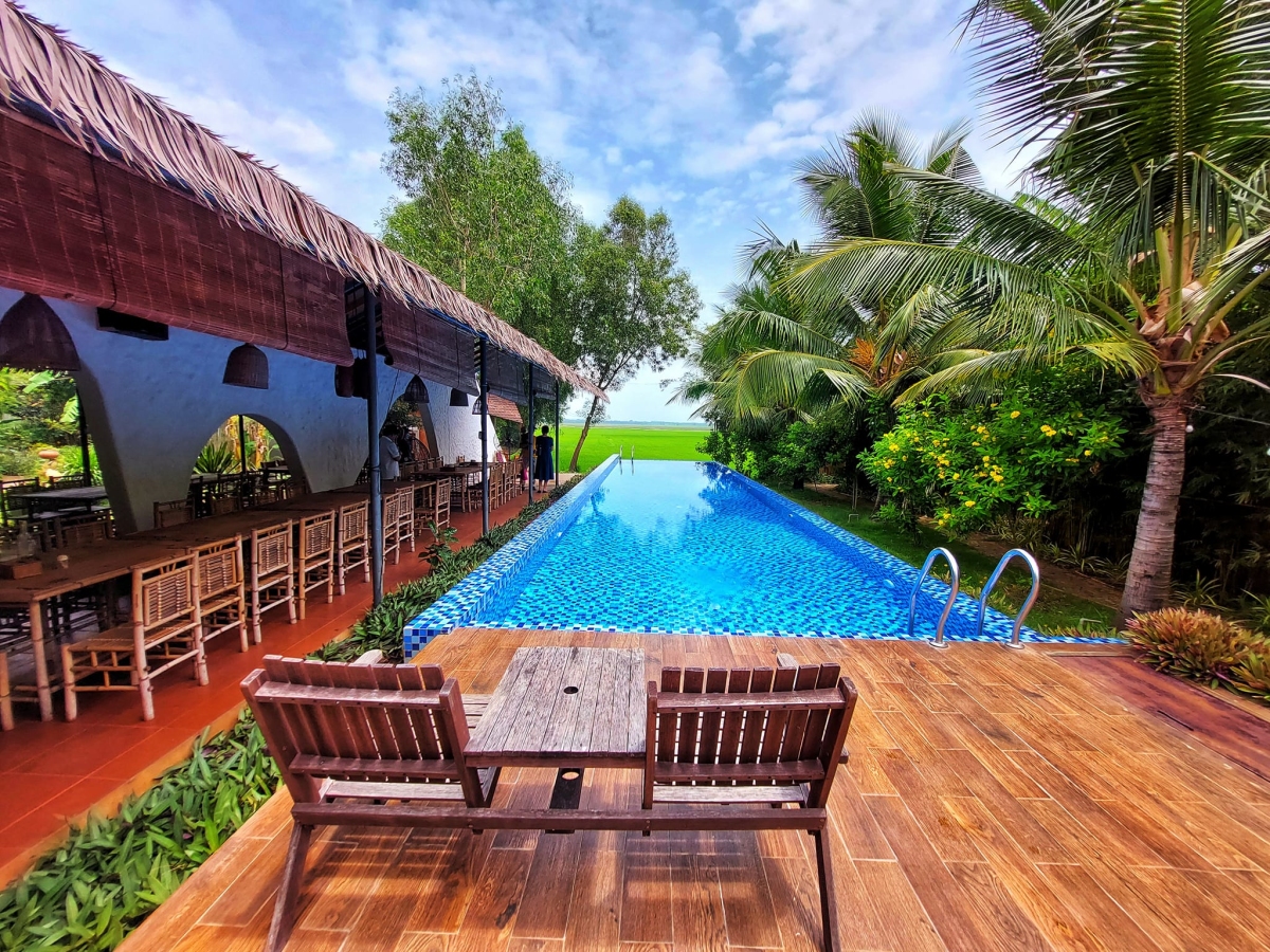 Khu nghỉ có các tiện ích như hồ bơi, bar, nhà hàng... du khách có thể chọn câu cá giải trí hay đi dạo quanh các hồ sen, ruộng lúa, hòa mình vào thiên nhiên tươi mát. Với khách gia đình hay nhóm bạn đông người, có thể chọn tổ chức tiệc tối BBQ ngoài trời, cảm giác như trở về miền quê thanh bình với tiếng côn trùng, ếch nhái kêu bên tai. Ảnh: Cécilia Ninh
