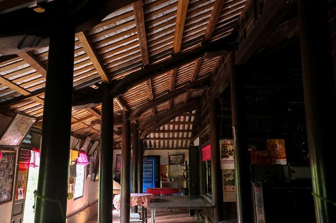 Xét về cách trang trí, du khách có thể thấy được sự tỉ mỉ, khéo léo cũng như trình độ chuyên môn cao của những nghệ nhân thời xưa. Toàn bộ hệ thống kèo được chạm nổi hết sức công phu, tỉ mỉ toát lên sự phóng khoáng và tao nhã. Ảnh: Quỳnh Trần.