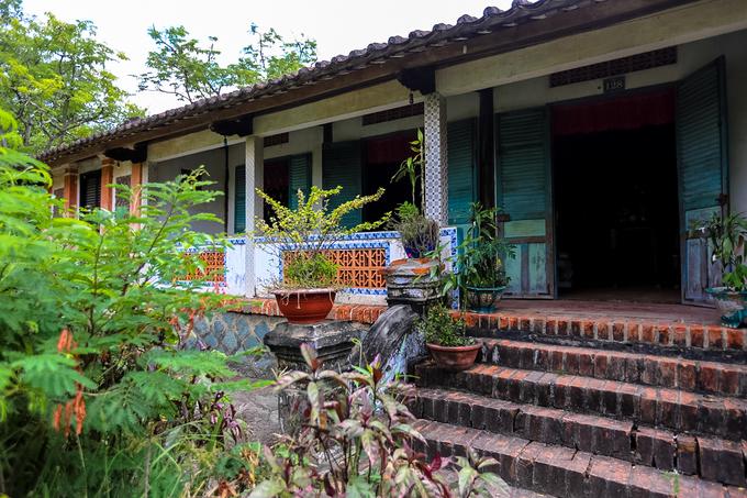 Tổng diện tích của công trình là 882 m2 nằm trên khu vườn có diện tích hơn 4.000 m2. Lối xây dựng là hình chữ quốc gồm ba gian và hai chái theo phong cách nhà rường xứ Huế. Vật liệu chính là gỗ với phần nền là đá tảng cao 0,9 m, phía trên lát gạch tàu lục giác. Ảnh: Quỳnh Trần.