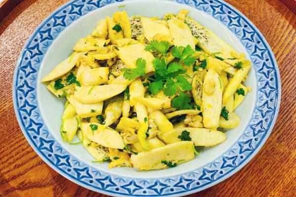 Các thành phần để xào cùng món niễng gồm trứng gà, rau mùi thơm, hành khô... Niễng non sẽ có ruột trắng, còn niễng để già sẽ xuất hiện các đốm đen (hình). Ảnh: Phương Thảo Thoạt nhìn, nhiều người dễ bị nhầm niễng với củ sả, vì chúng có hình dáng gần giống nhau, nhưng to hơn. Củ niễng có vỏ màu nâu sậm phía gần gốc và màu xanh phía trên ngọn, phần thân phình to. Khi bóc bớt lớp vỏ bên ngoài, bạn sẽ thấy bên trong là phần ruột màu trắng, mũm mĩm. Đây chính là nguyên liệu đầu bếp dùng để chế biến nên một trong những món ăn mang lại sự nổi tiếng cho ẩm thực thành Nam.