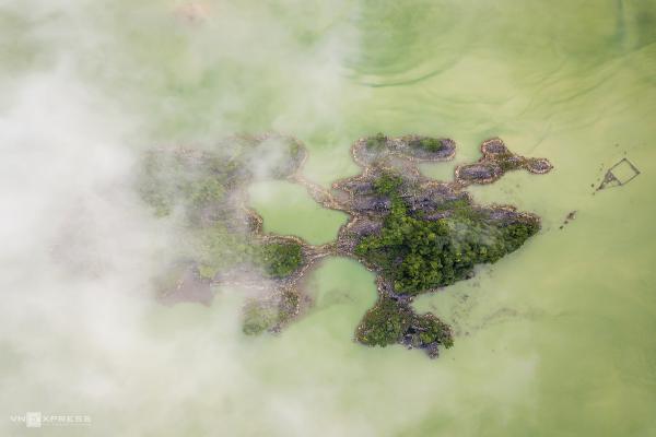 Sương mây lảng bảng trên các đảo đá vôi phủ đầy cây xanh ở hồ Na Hang, nơi được ví như vịnh Hạ Long thu nhỏ.
