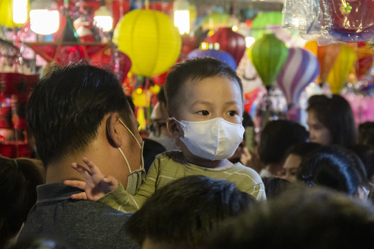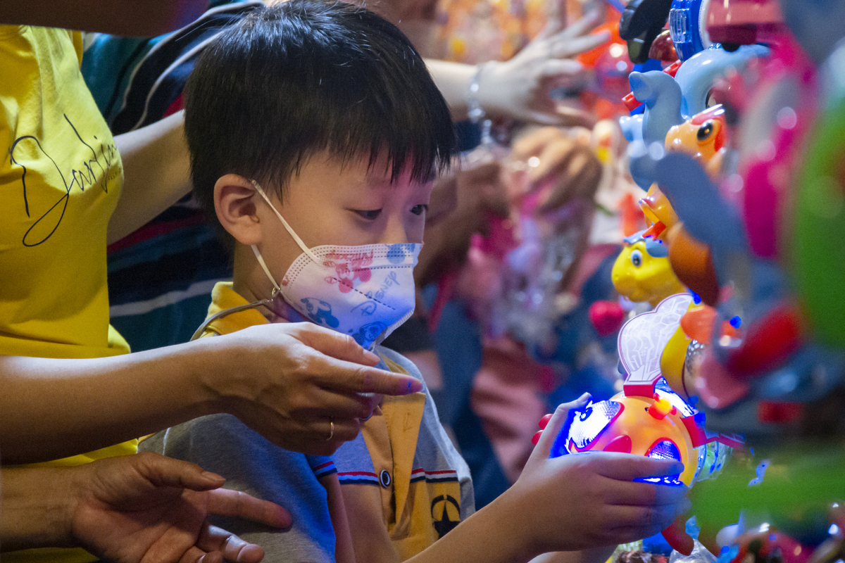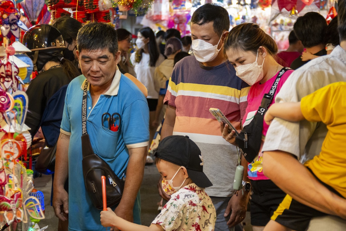 Dòng người len qua các tiệm bán lồng đèn, trẻ em còn được bố mẹ cõng trên vai.