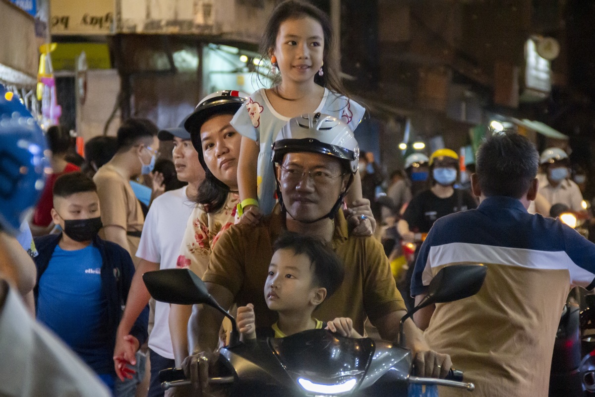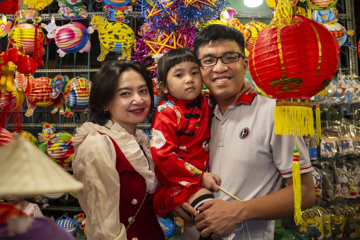 Vốn là điểm đến truyền thống vào dịp Trung thu, lượng người đổ về phố lồng đèn ngày càng đông, trong đó có gia đình anh Vũ Hòa Hiệp, đến từ quận Tân Phú. "Tôi thích chơi ảnh nên hay đến những nơi có sự kiện vui chơi như thế để tác nghiệp, khi chụp tôi xin phép dân, còn họ thì vui và thoải thoải", Trung nói.