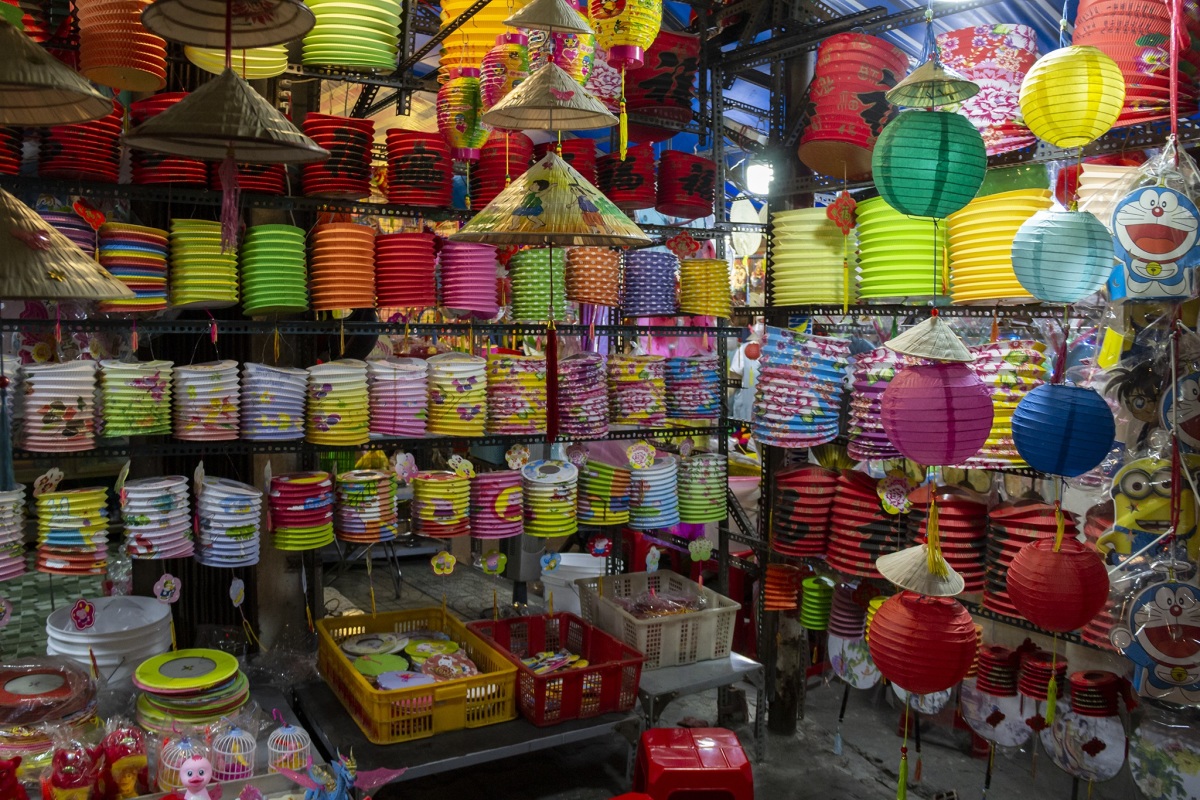 Không khí ở đây rất sôi động, với hơn 100 hộ kinh doanh đa dạng các mặt hàng chơi Trung thu, phong phú mẫu mã lồng đèn, từ lồng đèn truyền thống khung tre cho tới lồng đèn điện tử phát nhạc.