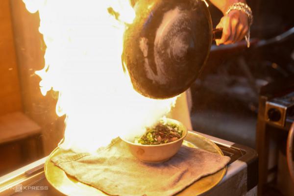 Ngọn lửa trong chảo quẹt qua tô phở trong tích tắc, vừa đủ làm cháy nhẹ phần rau thơm, qua đó làm tăng hương vị độc đáo.