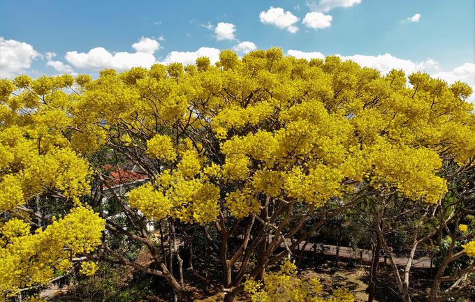 Phượng vàng còn có tên khác là Phật Y, là loài hoa quý hiếm có xuất xứ từ Brazil. Những ngày này, hoa nhuộm vàng cả một góc trời Bảo Lộc.