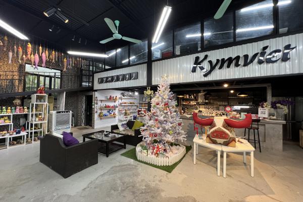 Nguyễn Thị Hằng, nhân viên của quán cà phê, cảm ơn khách bằng ngôn ngữ ký hiệu. Những người ở đây mong khách đến sẽ gọi họ đúng với cái tên "cộng đồng người điếc" thay vì "khiếm thính". Ảnh: Trung Nghĩa Tổ hợp KymViet Space đi vào hoạt động năm 2020 trên đường Trung Văn. Ở đây không chỉ có quán cà phê, mà còn gộp với xưởng sản xuất đồ thủ công từ năm 2013 và không gian trưng bày sản phẩm trên diện tích 450 m2 với 2 tầng. Tầng một có chỗ ngồi trong nhà và ngoài sân. Hiện quán còn có 2 cơ sở khác ở Hà Nội, với hơn 30 nhân viên, phần lớn đều là người khuyết tật, đặc biệt là người điếc.