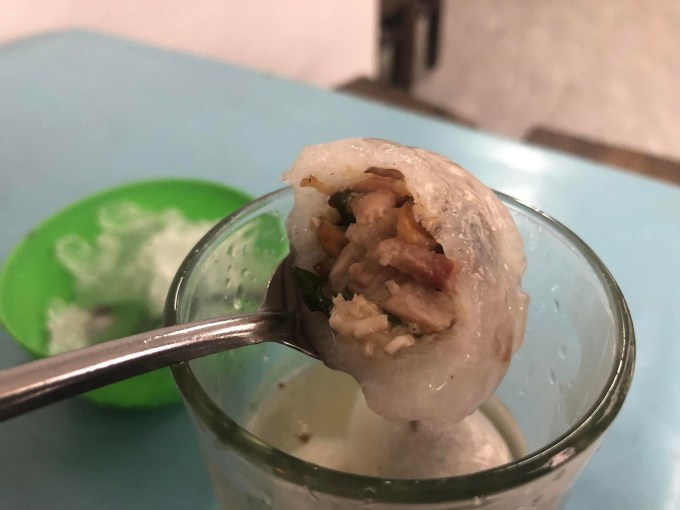 Món chè bột lọc heo quay, vừa ngọt vừa mặn. Ảnh: Võ Thạnh Lần đầu đến với quán chè Mợ Tôn Đích, chị Ngọc Yến ở TP Huế cho biết vị chè của quán có vị ngọt thanh, các nguyên liệu được nấu mềm ngon và không gian quán cũng sạch sẽ. "Đây là lần đầu tiên tôi được thử món chè bột lọc heo quay, tưởng sẽ rất khó ăn vì nó là sự kết hợp giữa vị mặn và vị ngọt. Nhưng khi được thưởng thức, tôi thấy đây là một sự kết hợp rất lạ và rất ngon, tôi rất thích", chị Yến cảm nhận.