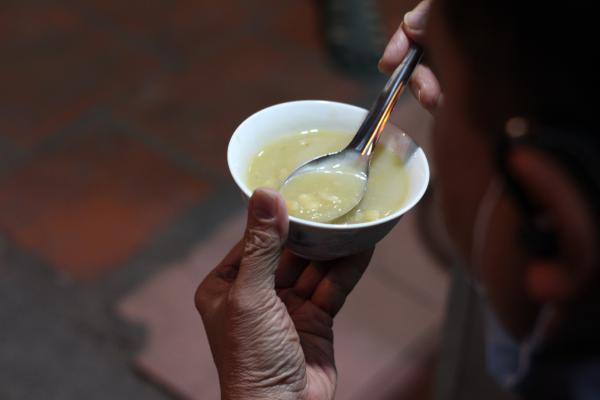 Nếu chè đỗ đen đã quá quen thuộc thì món chè lục tào xá của quán luôn khiến những vị khách lạ tò mò bởi tên gọi độc đáo - Ảnh: Hà Hiền"Lục tàu xá" có nghĩa là đậu xanh nát nhuyễn, cái tên ấy cũng đủ nói lên nguyên liệu chính của món ăn này. Để tăng hương vị cho món chè, gia đình bà Thơm còn cho thêm củ mã thầy và hạt sen. Tất cả quyện lấy vị đậu xanh béo bùi, đường cát ngọt ngào, mã thầy giòn tạo cảm giác thích thú khi ăn.