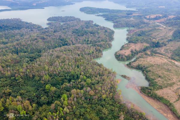 Cánh rừng nằm xen với lòng hồ thủy lợi thủy điện Rào Quán. Nhìn từ trên cao, du khách sẽ thấy dòng suối chảy ra hồ lớn.